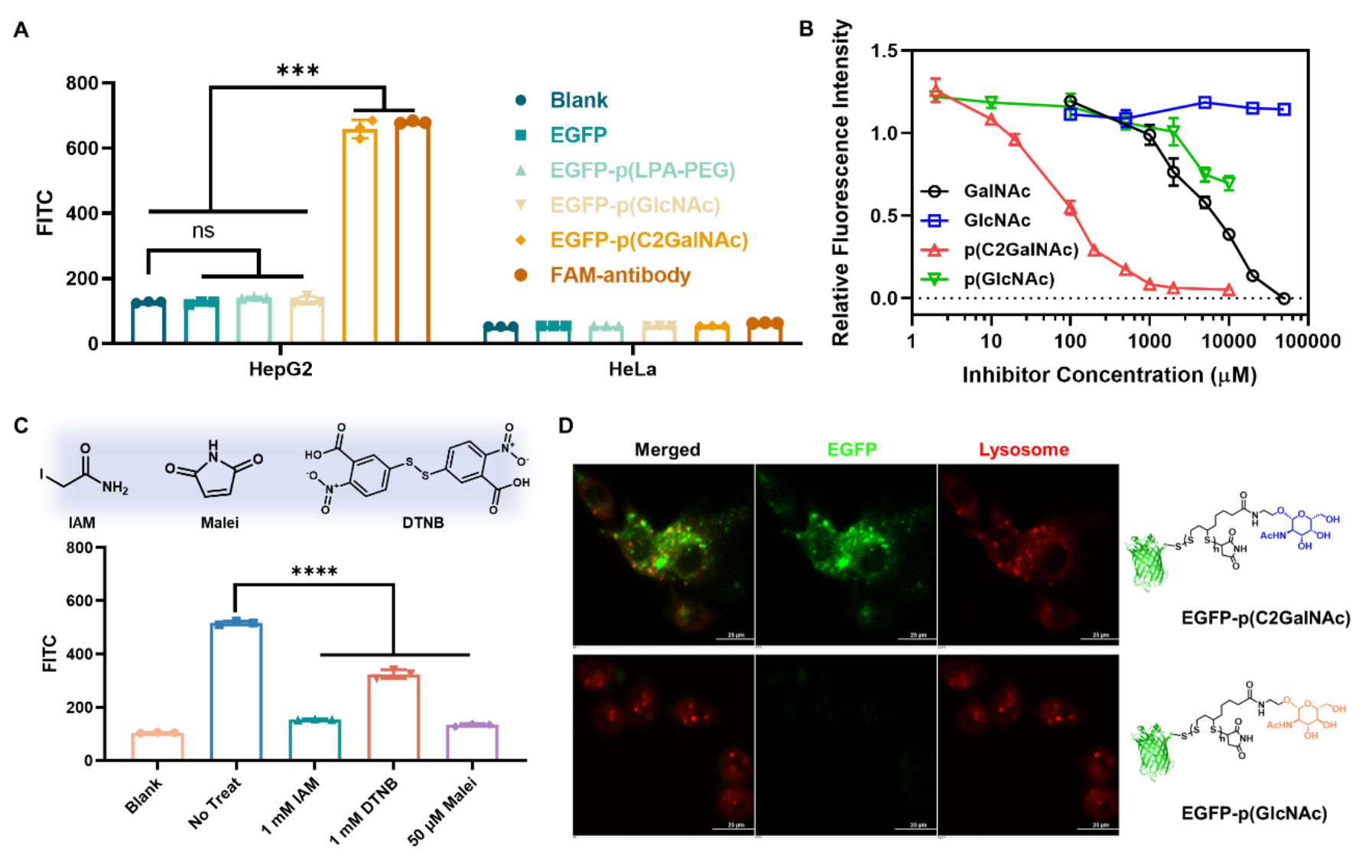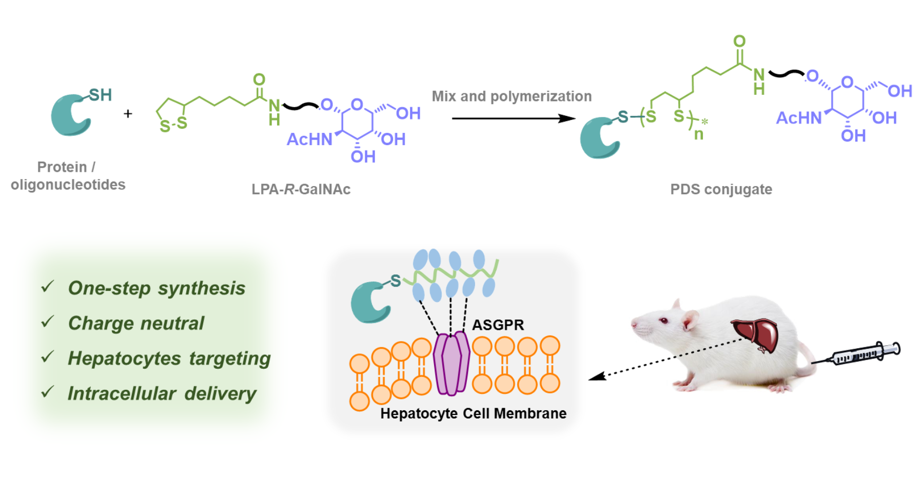 近日,北京大学化学与分子工程学院吕华课题组在《美国化学会志》(J. Am. Chem. Soc.)上发表题为“Organ/Cell-Selective Intracellular Delivery of Biologics via N-Acetylated Galactosamine-Functionalized Polydisulfide Conjugates”的研究论文。在这项工作中,作者开发了一种N-乙酰化半乳糖胺(GalNAc)功能化的聚二硫化物(PDS)与生物大分子的偶联物,成功将生物大分子靶向递送至肝细胞,为一系列肝脏靶向疾病的诊断和治疗开辟了新的途径。