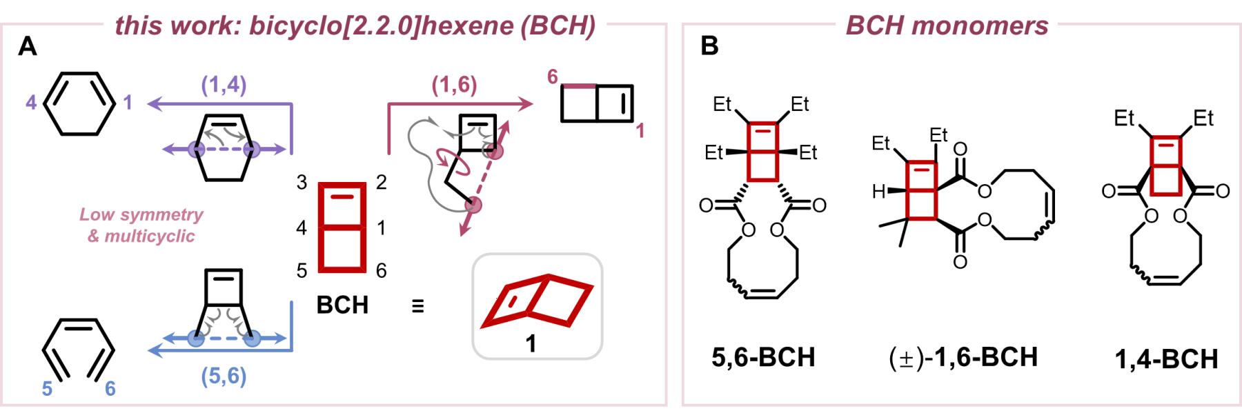 近日,北京大学刘允课题组与朱戎课题组合作,发掘了朱戎课题组发展的双环[2.2.0]己烯(BCH)结构(Nat. Commun. 2021, 12, 3680),展示了其力矢量控制的多通道反应性。他们利用BCH的低对称性和四元环并环结构,在改变外力的施加方向与位置时,高化学键选择性地激活了BCH骨架上不同的C–C键,实现了单一力敏团三种不同的反应性:逆4π开环反应、逆[2+2]环加成反应和σ[1,3]-重排反应(图2A)。