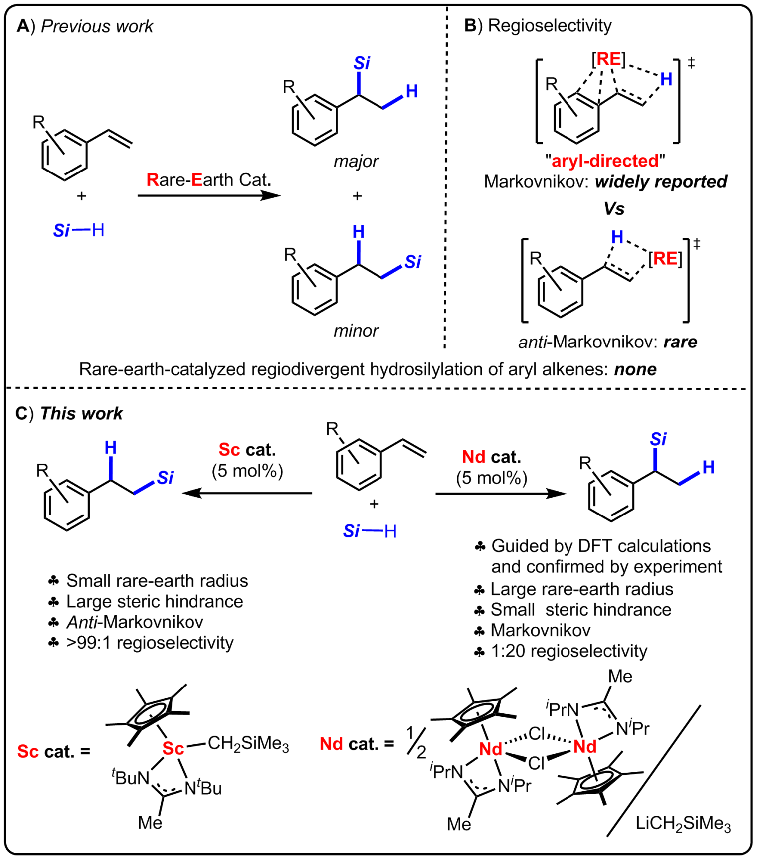 金属催化的烯烃硅氢化反应是制备有机硅化合物的一种高效、原子经济性方法,在学术界和工业界得到了广泛应用。长期以来,稀土金属催化剂被认为主要实现芳基烯烃的马氏硅氢加成反应,而催化反马氏硅氢化反应少见(图1A)。这种马氏选择性通常可归因于“芳基导向”效应,即带正电性的稀土离子与芳基烯烃中的芳烃之间强的π静电相互作用导致反马氏硅氢化不利(图1B)。到目前为止,开发有效的稀土催化剂体系实现芳基烯烃的选择性调控仍然是一个大的挑战。