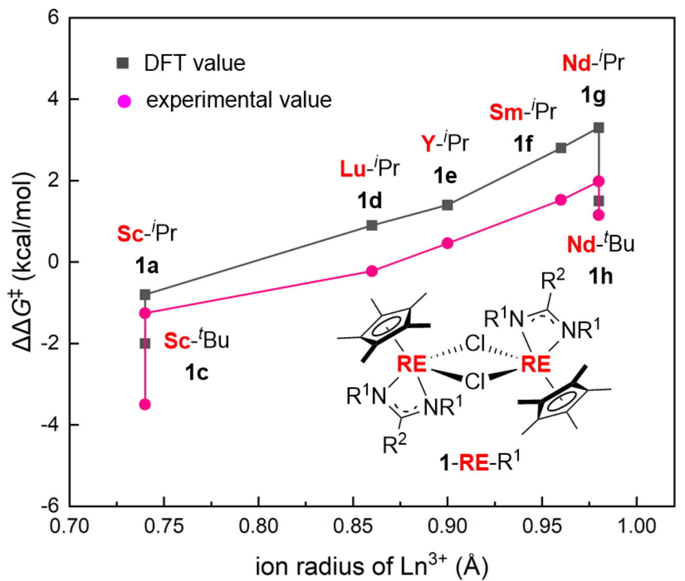在该研究中,通过使用具有大空间位阻配体的钪烷基化合物,实现了芳基烯烃硅氢化>99:1的反马氏选择性(图1C)。他们通过活性稀土氢化物和稀土苯乙基中间体的分离和表征,并结合DFT计算明确了该催化反应的机理,发现大空间位阻是实现高的反马氏选择性的决定性因素。基于这一点,通过对具有不同空间位阻的配体和不同离子半径的稀土活性中间体及过渡态进行DFT计算并确定过渡态能量差,他们预测了区域选择性的翻转而形成马氏选择性硅氢化反应。随后,他们合成了不同半径和配体位阻的单茂/单脒稀土卤化物,并通过大半径的单茂/单脒钕卤化物/LiCH2SiMe3催化苯乙烯硅氢化反应,实现了选择性的翻转,得到1:20的芳基烯烃的马氏硅氢化反应产物(图1C)。实验结果证实了DFT 计算的预测(图2)。