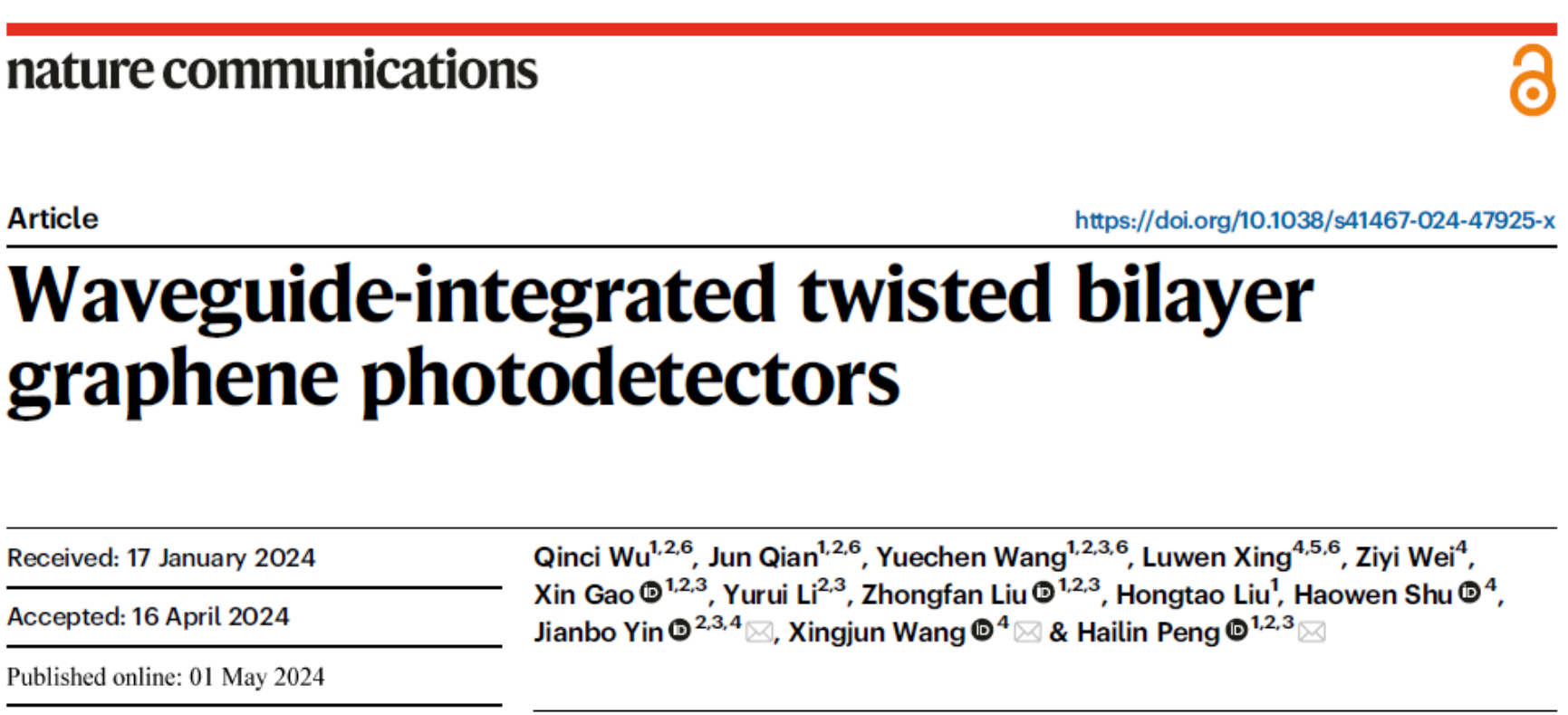 针对以上问题,北京大学化学与分子工程学院彭海琳课题组与北京大学电子学院王兴军教授、尹建波研究员合作,提出了高响应度石墨烯探测器的设计策略,利用扭转双层石墨烯作为光吸收材料,实现了兼具高响应度和高带宽的硅波导集成扭转双层石墨烯光探测器的制备,相关工作以“Waveguide-integrated twisted bilayer graphene photodetectors”为题,于2024年5月1日,发表在《自然·通讯》(Nature Communications)期刊上(Nature Commun. 2024, 15, 3688)。