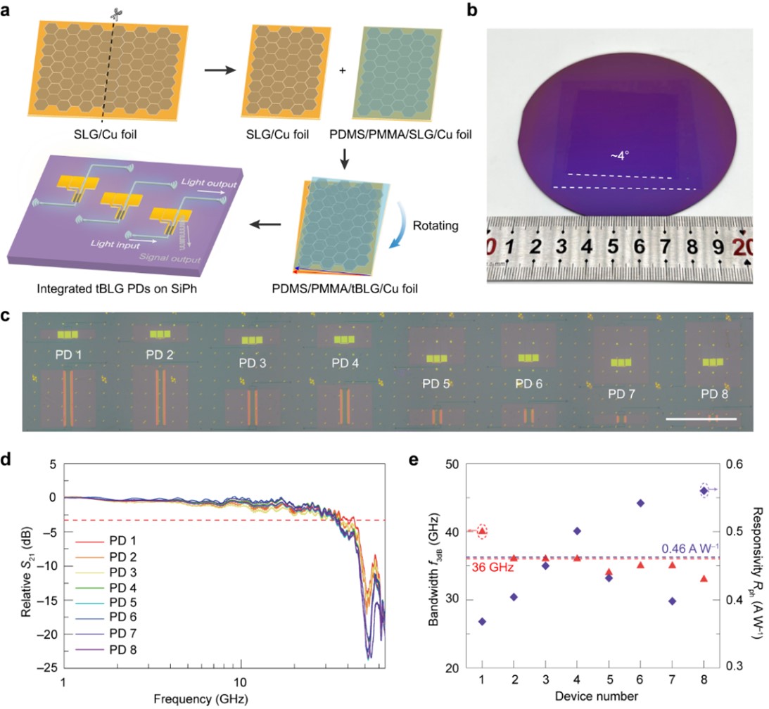 为验证将大面积tBLG与硅光集成的可能性,该研究基于石墨烯薄膜可控叠层转移技术构筑了大面积的波导集成tBLG光探测器阵列,展现出36±2GHz的高带宽及0.46±0.07A/W的高响应度,具有良好的均一性能,证明了大规模集成tBLG并制备高性能光通信器件的可能性。