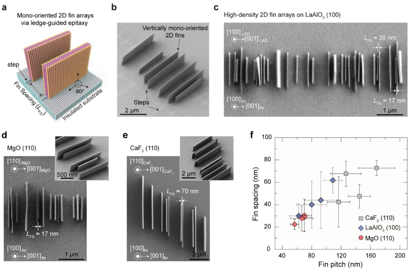 图1. 单一取向二维Bi2O2Se鳍片阵列的台阶诱导外延。(a)在台阶处成核的二维鳍片示意图;(b)台阶诱导外延生长的单一取向二维Bi2O2Se鳍片阵列的倾角扫描电镜图像;(c-e)不同衬底上台阶诱导外延生长的高密度二维Bi2O2Se鳍片阵列的扫描电镜图像;(f)不同衬底上不同阵列中最小鳍片间距统计。