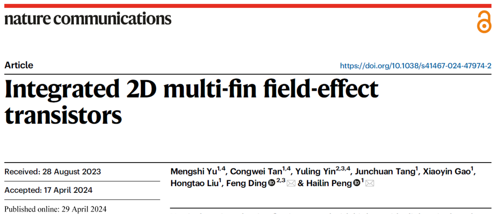 该研究成果以“集成型多通道二维鳍式晶体管”(Integrated 2D multi-finfield-effecttransistors)为题,近日发表于Nature Communications。北京大学化学与分子工程学院彭海琳教授、深圳先进技术研究院丁峰教授是该论文的共同通讯作者,北京大学化学与分子工程学院博士研究生于梦诗、BMSFellow博士后谭聪伟、深圳先进技术研究院博士后尹玉玲是共同第一作者。