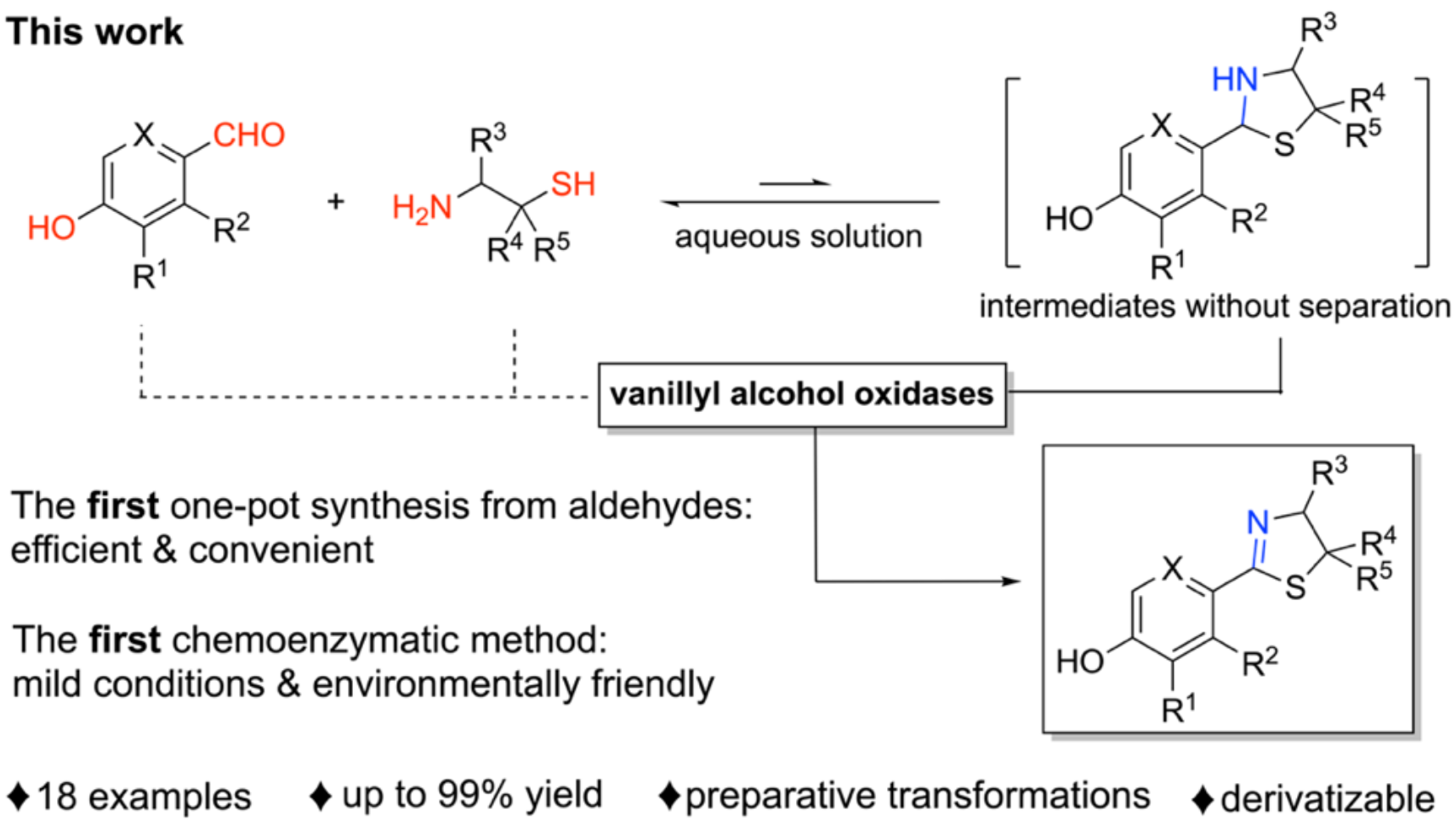 酶催化由于其催化效率高、反应选择性好、条件温和、环境友好等优势,在有机合成的研究领域越来越受到重视。微生物来源的香草醇氧化酶(Vanillyl Alcohol Oxidases, VAOs)具有化学特异性的苄位氧化能力,在自然界中能够将香草醇氧化为香草醛。基于VAOs的催化特性,北京大学化学与分子工程学院雷晓光团队在Angew. Chem. Int. Ed.杂志上报道了首例噻唑啉的化学酶法合成方法。在该方法中,4-羟基苯甲醛和2-氨基硫醇在水溶液首先中通过缩合反应产生微量的噻唑烷中间体,随后VAOs选择性地氧化该中间体从而生成最终的噻唑啉产物。该方法不仅首次实现了直接从醛出发的噻唑啉一锅法合成,同时拓展了VAOs“新于自然”(new to nature)的催化活性。该化学酶法合成策略具有条件温和,环境友好等优势,可以被应用于含氮杂环药物分子的工业化合成。