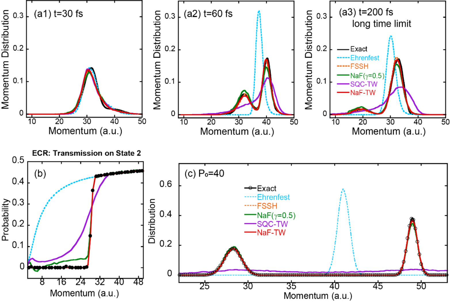 图5:(a1)-(a3)分别展示了NaF-TW、SQC-TW、NaF(采用CPS)、Ehrenfest动力学以及FSSH在三态Morse势光解离动力学中原子核动量分别在t=30fs、60fs以及200fs时的分布情况。(b) 描述了上述不同方法在Tully的ECR散射模型中,隧穿在第二个态上的概率随着入射动量分布中心值的变化曲线。(c) 对应于上述不同方法在Tully的ECR散射模型中入射动量分布中心值为40a.u.时的动量分布情况。