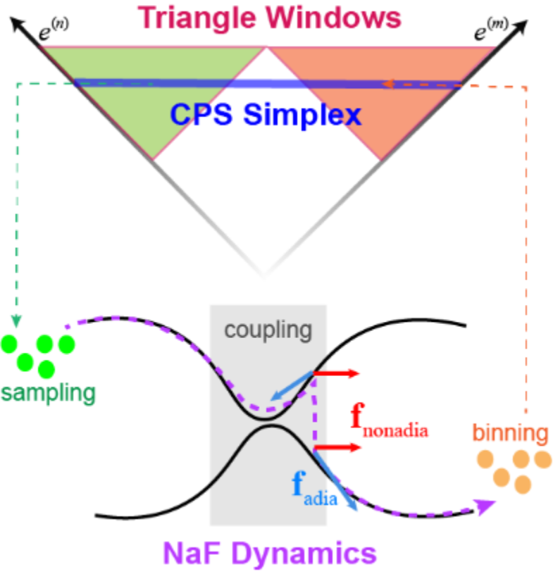 对比目前两类主要的(独立)轨线动力学方法:一类是基于瞬时跃迁转移近似连接不同单绝热态势能面(PES)生成的玻恩-奥本海默(BO)轨线所发展出的面跳跃(Surface Hopping)动力学;另一类方法则依据1927年埃伦费斯特(Ehrenfest)定理的精神,采用原子核在平均势能面上运动的平均场动力学近似图像。与以上两类传统非绝热动力学方法概念上不同的NaF方法将轨线近似中的原子核受力分为两项:除包含在单一电子态势能面上的绝热力外,还包含一项重要的非绝热力。NaF方法在根本思想上与上述两类传统方法有显著区别,能够更可靠地描述原子核运动和电子之间的动态相互作用,并自然地捕捉到原子核运动行为在非绝热耦合区域与非绝热耦合消失区域的变化。