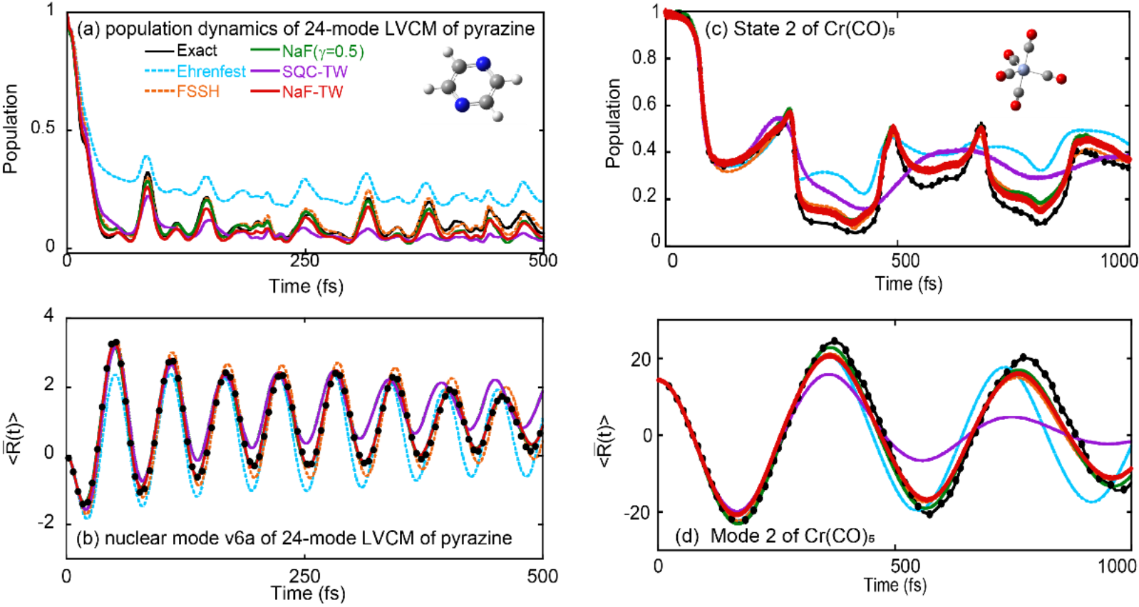 图4:(a)-(b)展示了NaF-TW、SQC-TW、NaF(采用CPS)、Ehrenfest动力学以及FSSH在24模-2态的吡嗪分子经过锥形交叉过程中的布居数动力学以及简正模位置期望随时间的变化。(c)-(d)对应着3态的Cr(CO)5分子经过锥形交叉过程中的布居数动力学以及简正模位置期望随时间的变化。