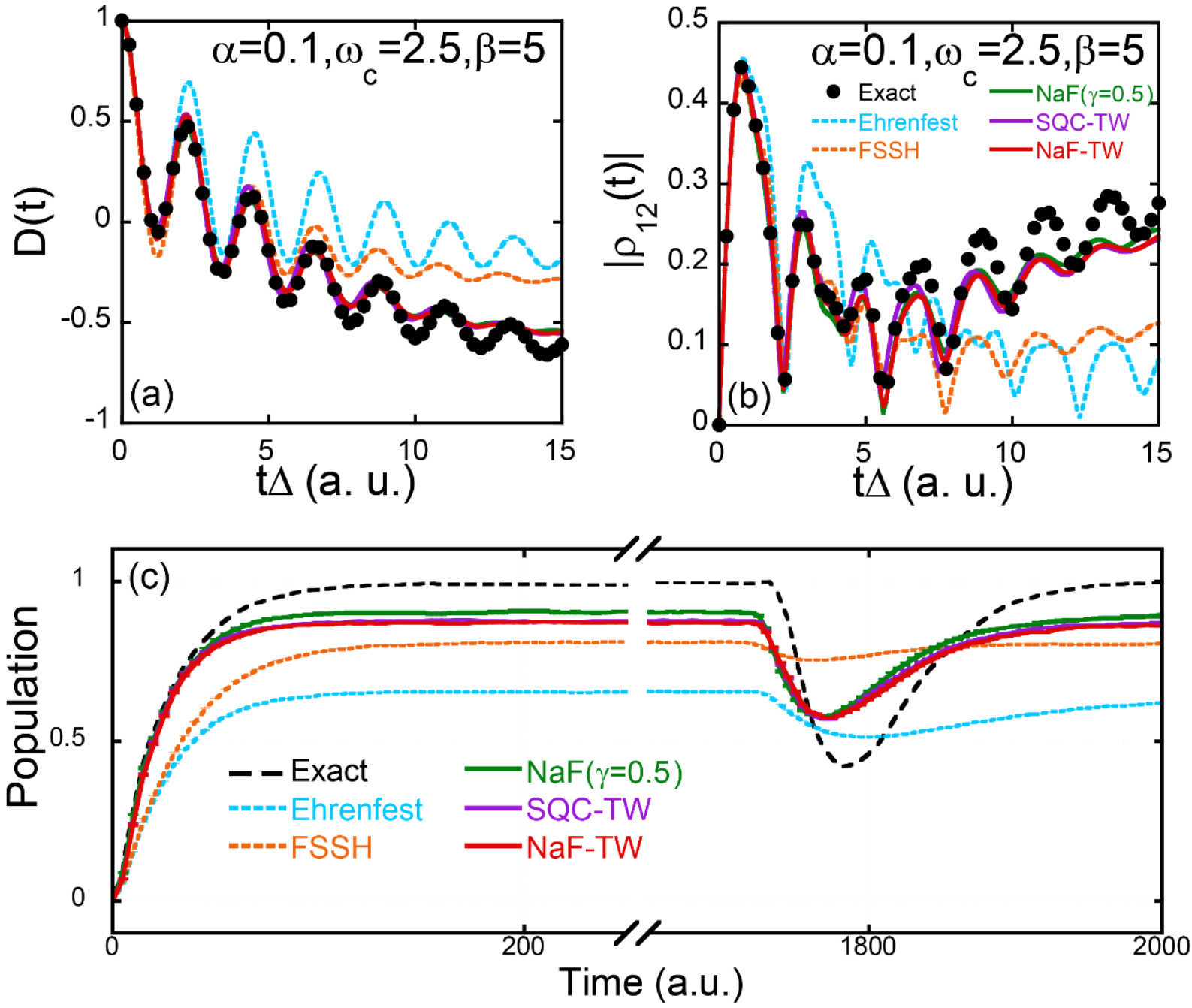 图2:在两态模型中,我们对比了NaF-TW、SQC-TW、NaF(采用CPS)、Ehrenfest动力学以及FSSH(最少面跳跃)的结果:(a) 展示了自旋玻色模型中的电子态布居数之差的动力学,(b) 显示了自旋玻色模型中的密度矩阵非对角元模的动力学,而(c) 则呈现了两能级的原子-光腔模型的布居数动力学结果。