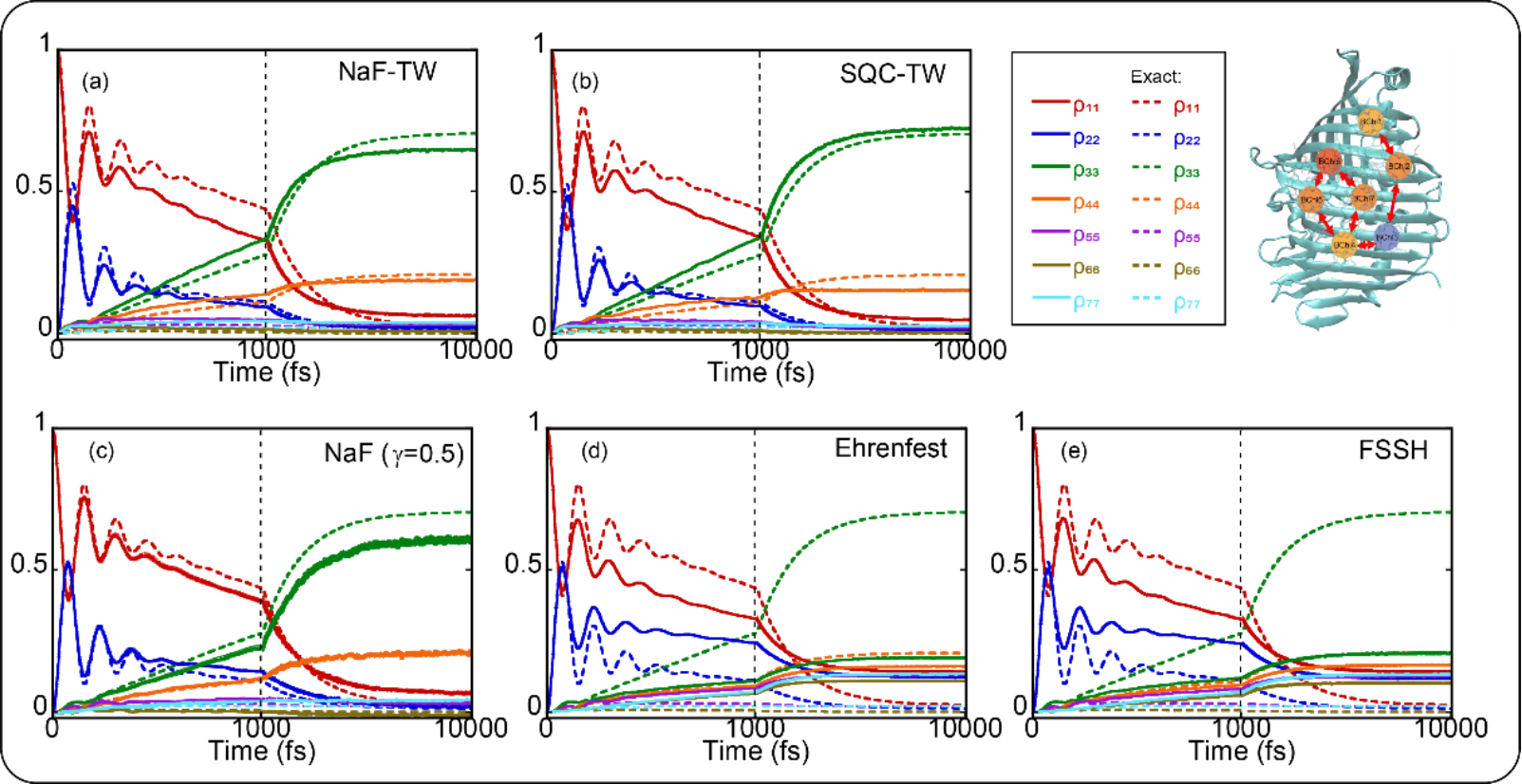 图3:(a)-(e)分别展示了在七态FMO模型中采用的布居数动力学结果,其中(a)为NaF-TW,(b)为SQC-TW,(c)为NaF(采用CPS),(d)为Ehrenfest动力学,(e)为FSSH。