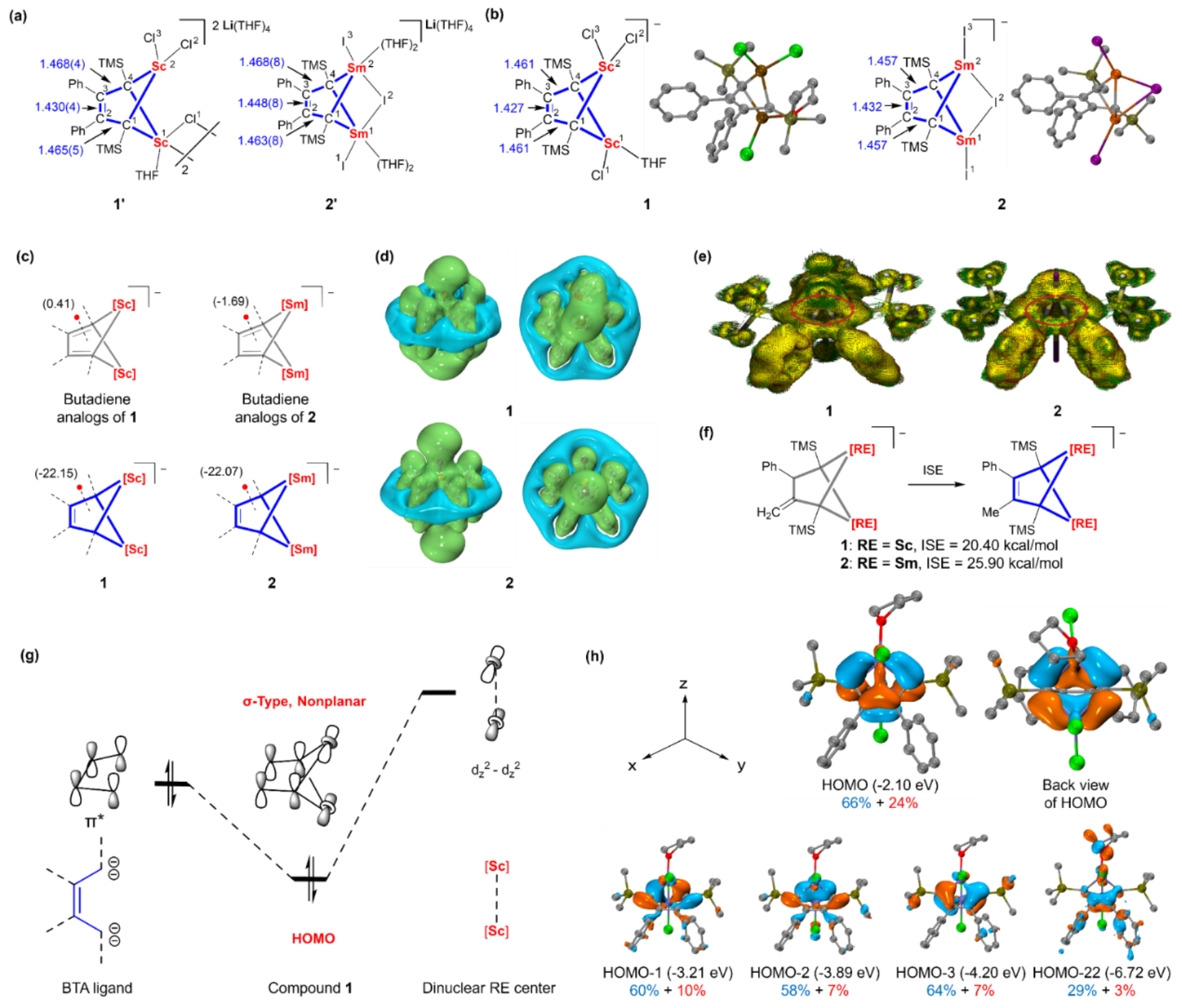 图2. 非平面芳香性双核钪和钐杂环的分子结构、DFT优化结构、芳香性评估及电子结构计算