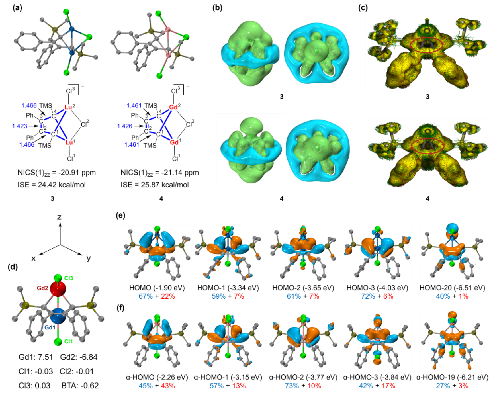 以上研究阐明了这种非平面芳香性的来源,而这也是富电子的2-丁烯烯四阴离子配体得以稳定存在的根源。基于此,他们预测可能存在其他非平面芳香性稀土金属杂环,因此,利用DFT计算优化出了镥和钆的双核稀土金属杂环结构(图3a)。这两个分子同样具有平均化的键长,且表现出明显的芳香性特征,其电子结构与钪和钐杂环分子基本一致,同样存在5c-6e共轭体系(图3b-e)。