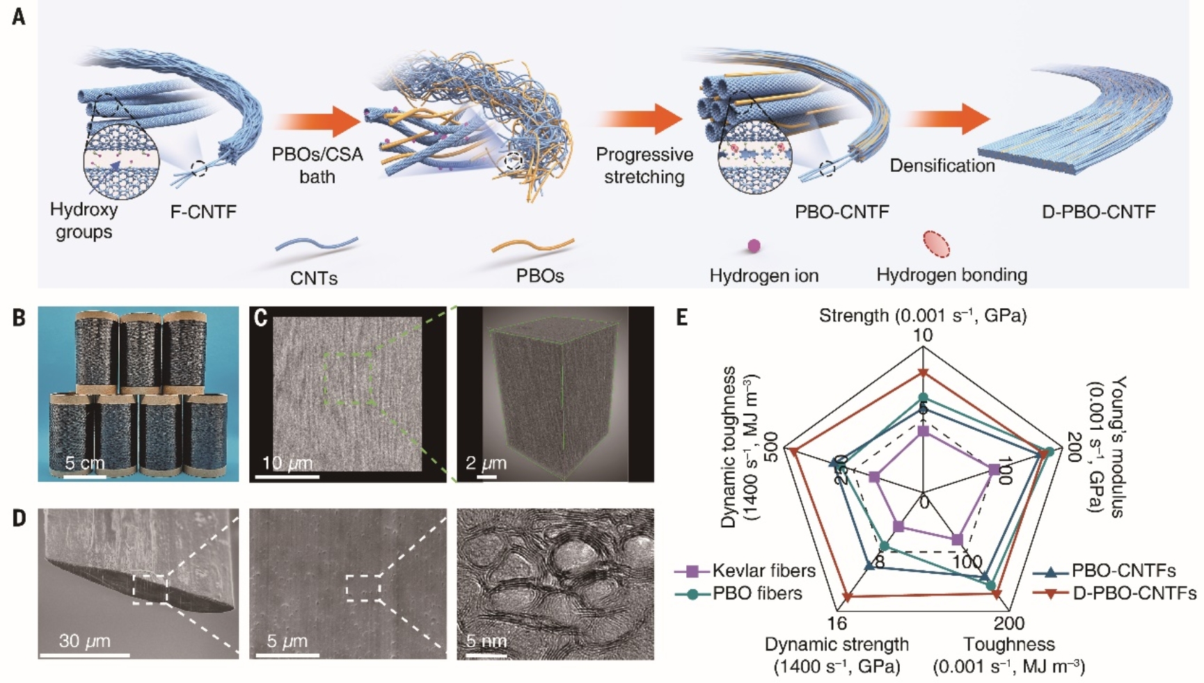 图1 碳纳米管纤维的制备、结构与性能。(A)多尺度结构优化策略制备高性能碳纳米管纤维;(B-D)碳纳米管纤维的结构表征;(E)碳纳米管纤维与其他纤维的力学性能对比。