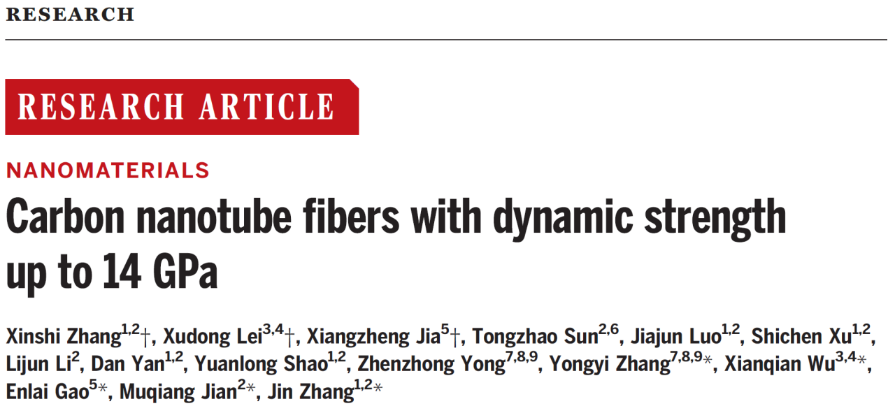 北京大学化学与分子工程学院/材料科学与工程学院/北京石墨烯研究院张锦院士、北京石墨烯研究院蹇木强副研究员、中科院力学所吴先前研究员、武汉大学高恩来副教授、中科院苏州纳米所/中国科学技术大学/江西省纳米技术研究院张永毅研究员等紧密合作,于2024年6月21日在Science杂志在线发表了题为“Carbon nanotube fibers with dynamic strength up to 14 GPa”研究论文。该工作提出一种高动态强度碳纳米管纤维的制备方法,通过引入聚对苯撑苯并二噁唑(PBO)增强碳纳米管管间作用、机械训练提高取向性和机械处理提高纤维致密性,获得了动态强度高达14 GPa的碳纳米管纤维。