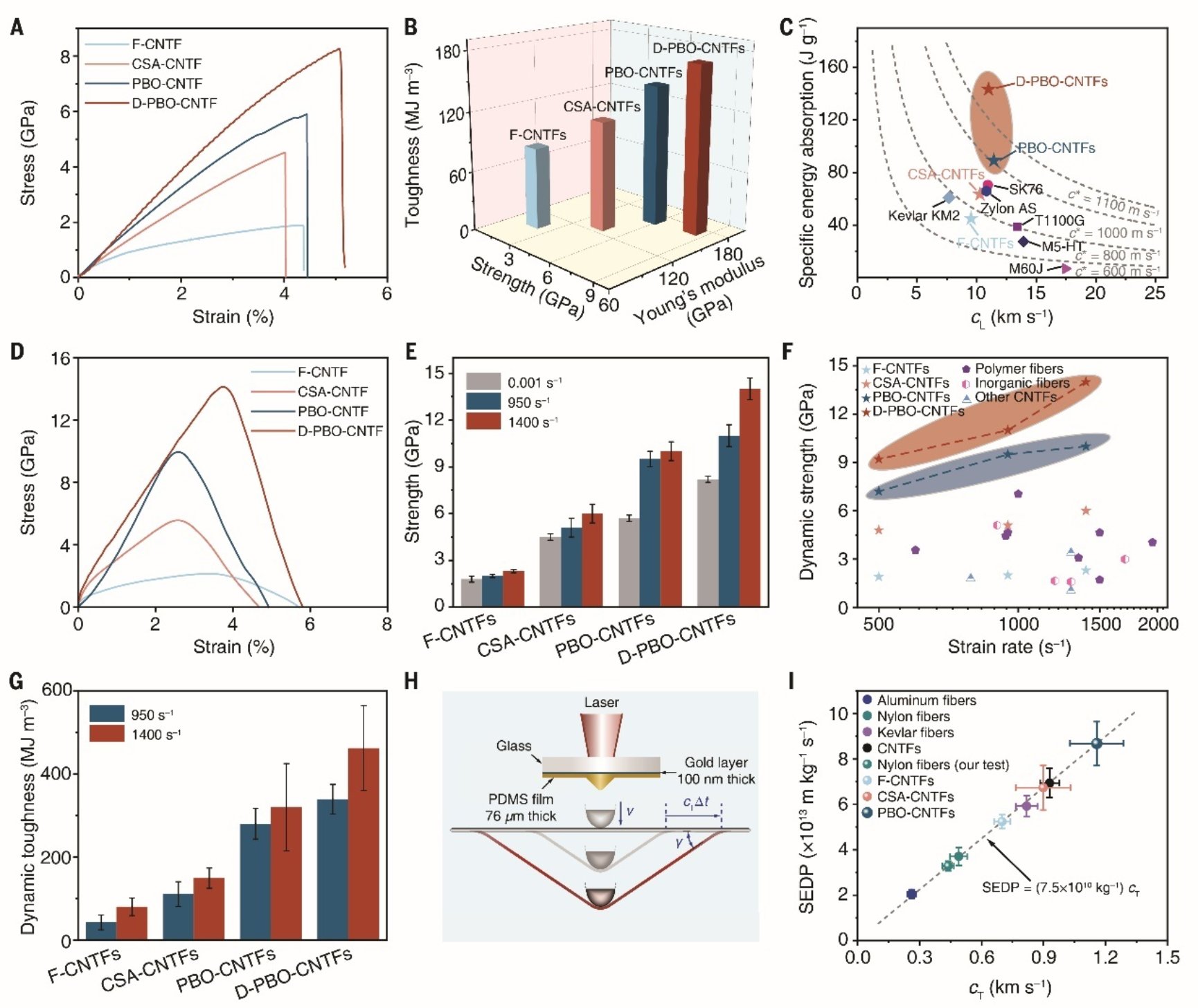 图2 碳纳米管纤维的力学性能。(A)碳纳米管纤维在准静态加载下的应力-应变曲线;(B)碳纳米管纤维在准静态加载下的拉伸强度、杨氏模量和韧性;(C)不同纤维的比能量吸收和纵波波速对比;(D)碳纳米管纤维在高应变率加载下的应力-应变曲线;(E)不同应变率加载下碳纳米管纤维的拉伸强度;(F)碳纳米管纤维与其他纤维的动态强度对比;(G)不同应变率加载下碳纳米管纤维的动态韧性;(H)激光诱导高速横向冲击纤维的示意图;(I)不同纤维的比能量耗散功率。