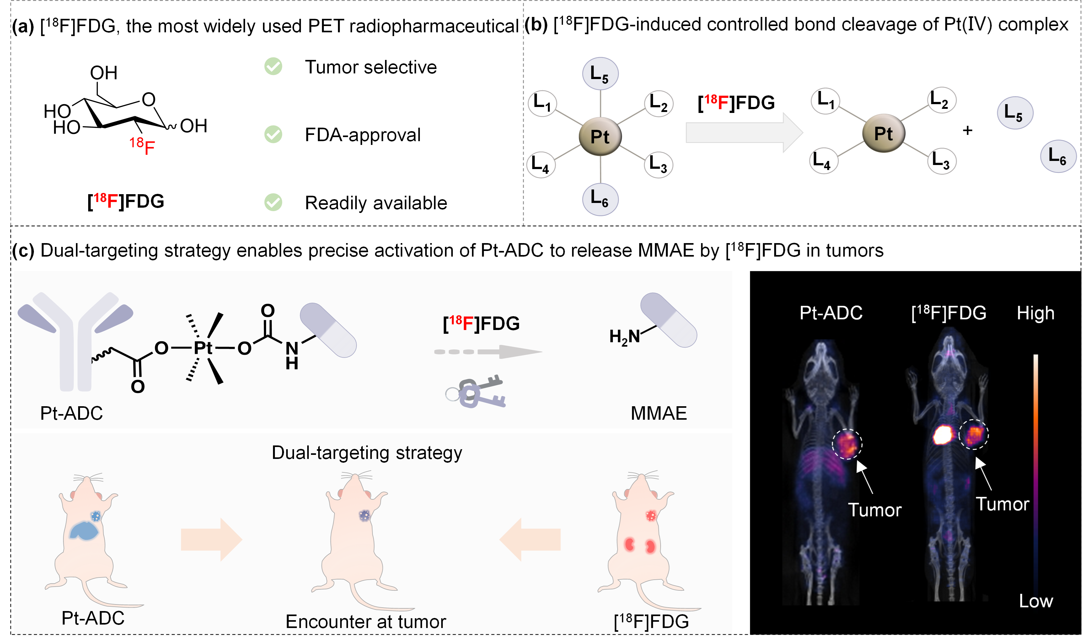 随后,研究者将[18F]FDG可控激活四价铂前药策略应用于ADC药物。ADC药物可以靶向肿瘤,经肝胆代谢排出体外;而[18F]FDG同样可以靶向肿瘤,经肾脏代谢排出体外。因此,ADC药物和前药激活剂[18F]FDG仅在肿瘤处相遇,利用双重靶向策略实现了肿瘤部位的前药精准激活。