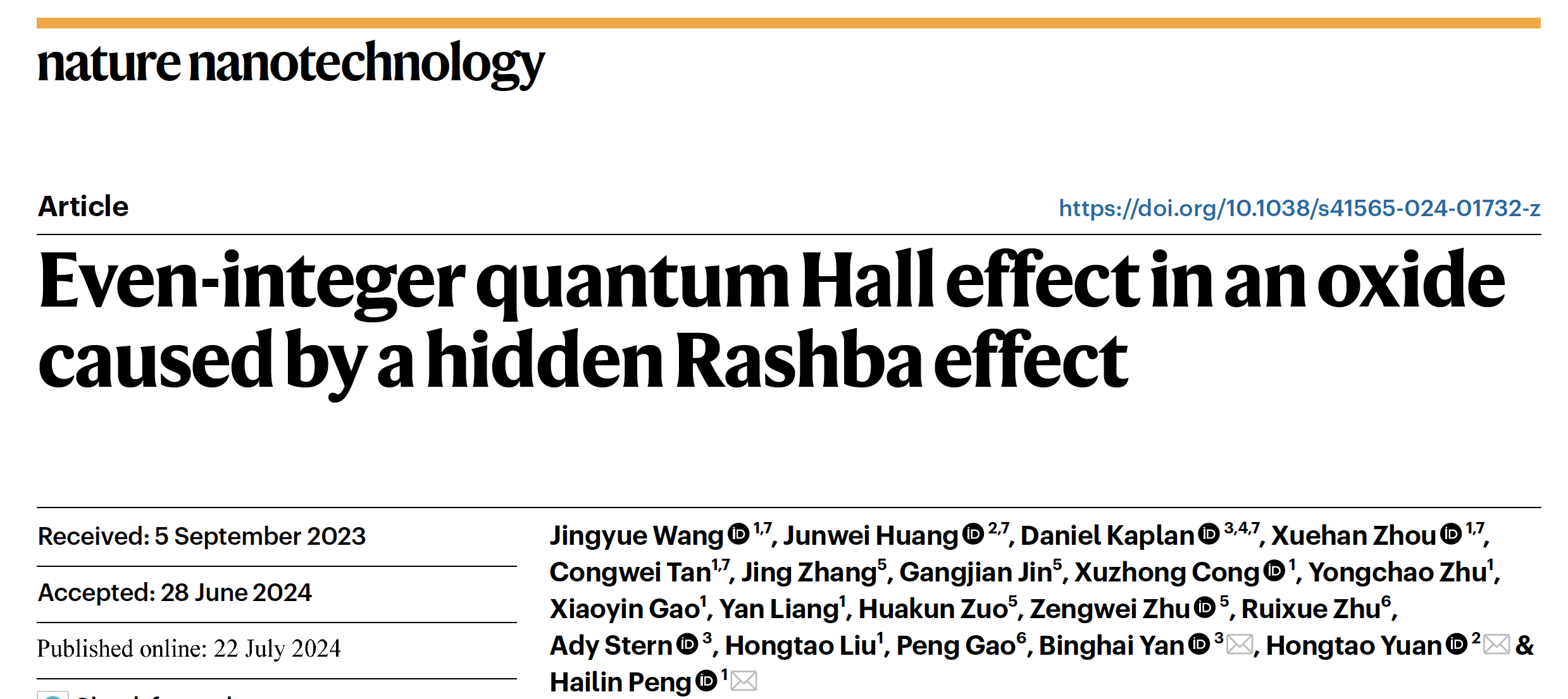 2024年7月22日,北京大学化学与分子工程学院彭海琳教授研究团队与南京大学袁洪涛教授团队、以色列威兹曼研究院颜丙海教授团队在《自然—纳米技术》( Nature Nanotechnology )在线发表了题为“Even-integer quantum Hall effect in an oxide caused by a hidden Rashba effect”的研究论文,报道了二维铋基半导体硒氧化铋(Bi2O2Se)中新奇的隐藏自旋极化,并首次发现了偶数量子霍尔效应。