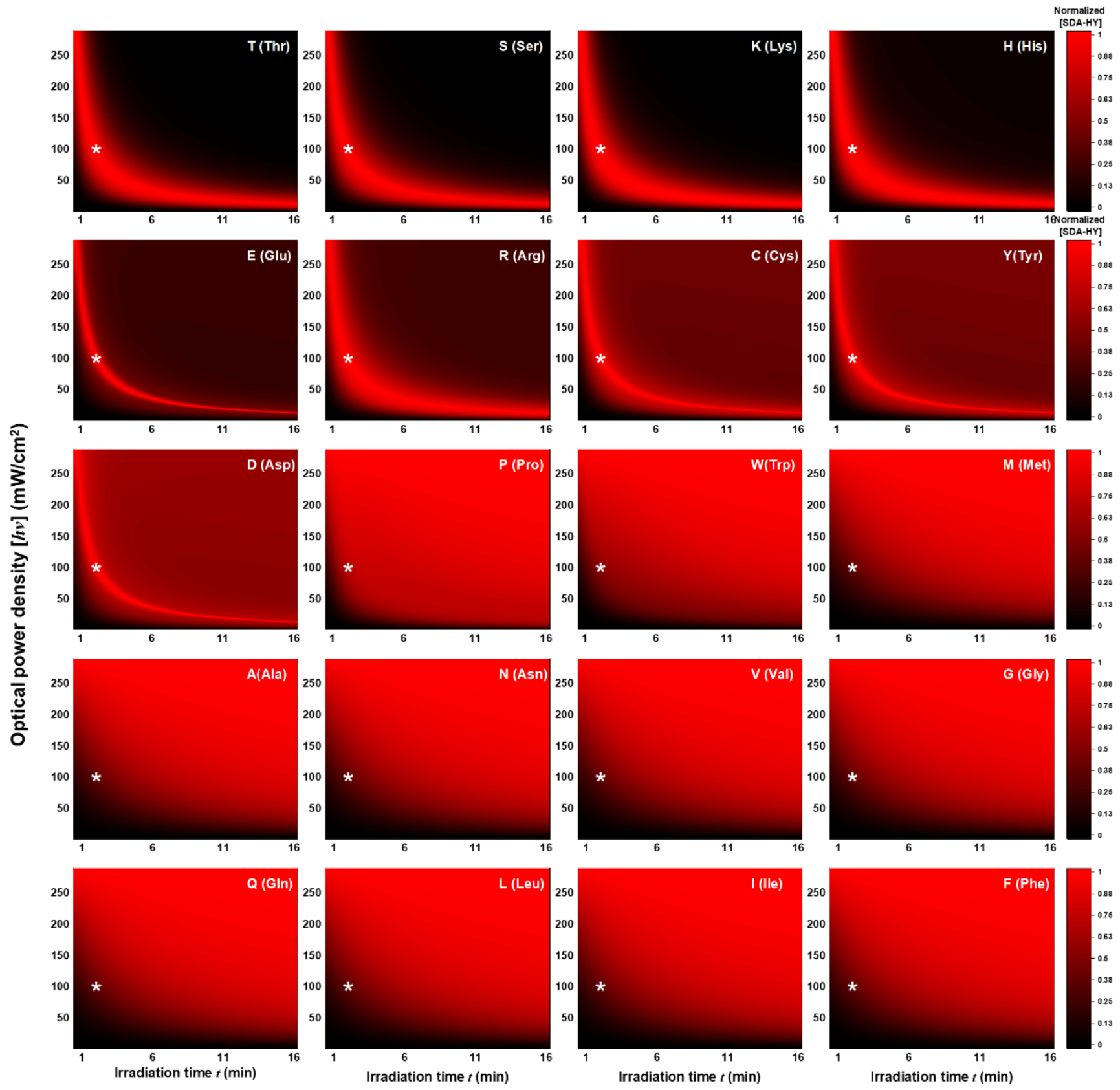 图4: 烷基二氮丙啶对蛋白质残基的偏好随照射时间和功率密度的变化。