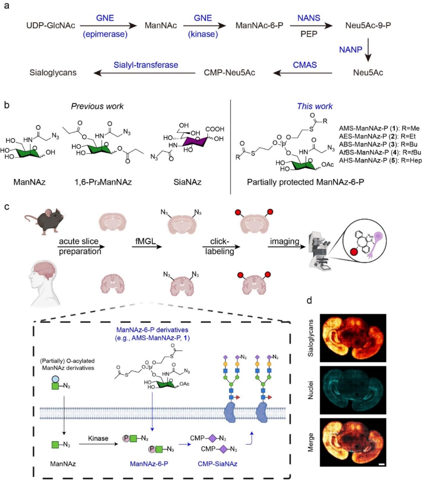 目前,在活体中进行唾液酸化糖质特异性标记和成像,主要依赖基于生物正交反应的代谢糖质标记技术4-6。该方法通过将含有生物正交基团(例如叠氮或端炔)的非天然单糖通过糖代谢整合到糖质中,进而利用生物正交反应或点击化学连接荧光分子进行成像。尽管代谢糖质标记已被广泛应用于各种细胞和小鼠等动物的糖质成像研究,但是目前还难以用于临床脑组织样品的研究。对于临床相关研究,急性脑组织切片是一种实用且功能强大的研究体系,然而通常只有6至12小时的生命周期。而代谢糖质标记往往需要2至7天的时间。这一时间上的差异,阻碍了代谢糖质标记在临床样品研究中的应用。