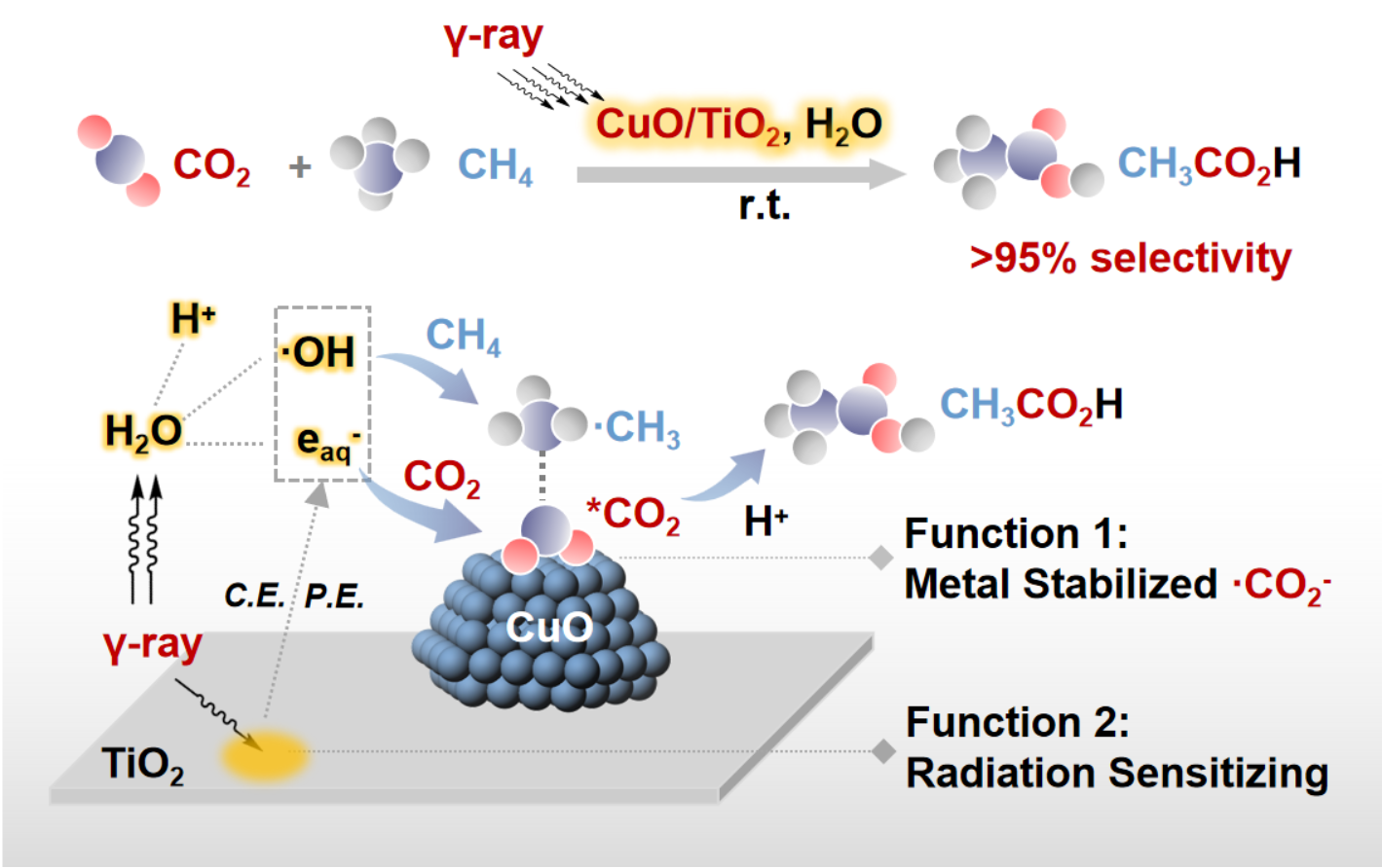 近日,北京大学化学与分子工程学院刘志博教授团队与北京大学马丁教授团队合作在Angew. Chem. Int. Ed.上发表了题为“Radiocatalytic Synthesis of Acetic Acid from CH4 and CO2”的研究工作。该工作利用电离辐射作为赋能方式,同时利用水辐解产生的氧化性羟基自由基(·OH)和还原性水合电子(e−aq),实现了甲烷(CH4)与二氧化碳(CO2)的氧化还原偶联反应,在室温下合成了醋酸(CH3COOH)。