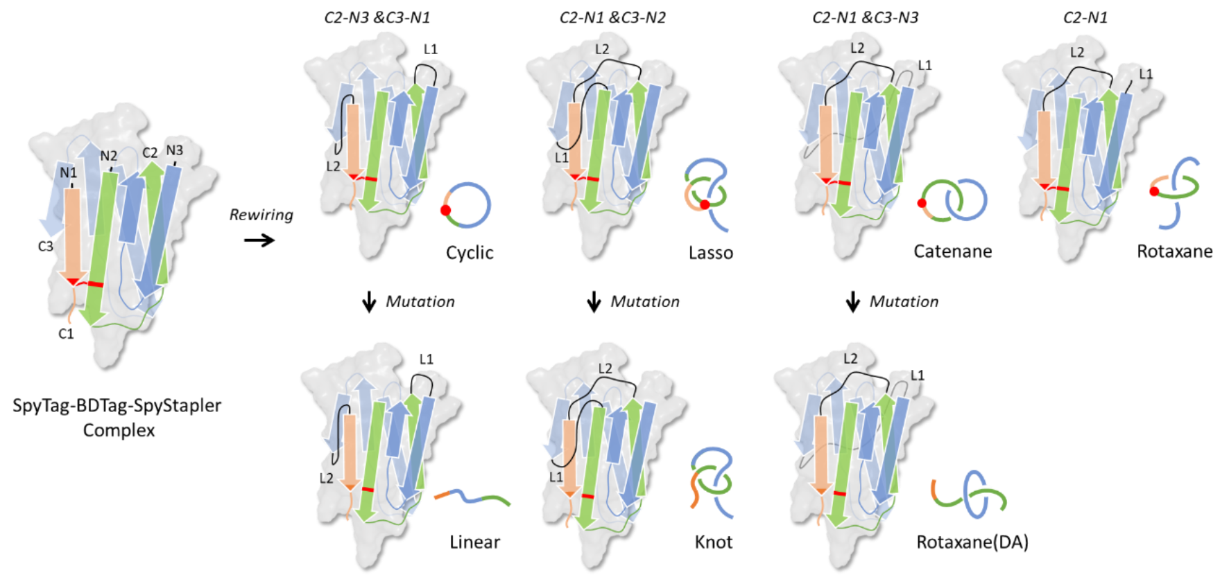 近期,北京大学张文彬课题组在单结构域蛋白质拓扑设计和合成方面取得了重要进展。他们将谍结构域(SpyTag/SpyCatcher)拆分为SpyTag、BDTag和SpyStapler,通过重新编辑三组分之间的连接关系引入缠结关系,设计并合成了索烃蛋白(Catenane)、环状蛋白(Cyclic)、套索蛋白(Lasso)以及准轮烷蛋白(Rotaxane),并通过突变其中一个活性位点,废除原本的异肽键连接,得到了线型蛋白(Linear)、纽结蛋白(Knot)和另一种准轮烷蛋白(Rotaxane(DA))(图1、图2),实现了单结构域蛋白质拓扑亚型的系统构建。