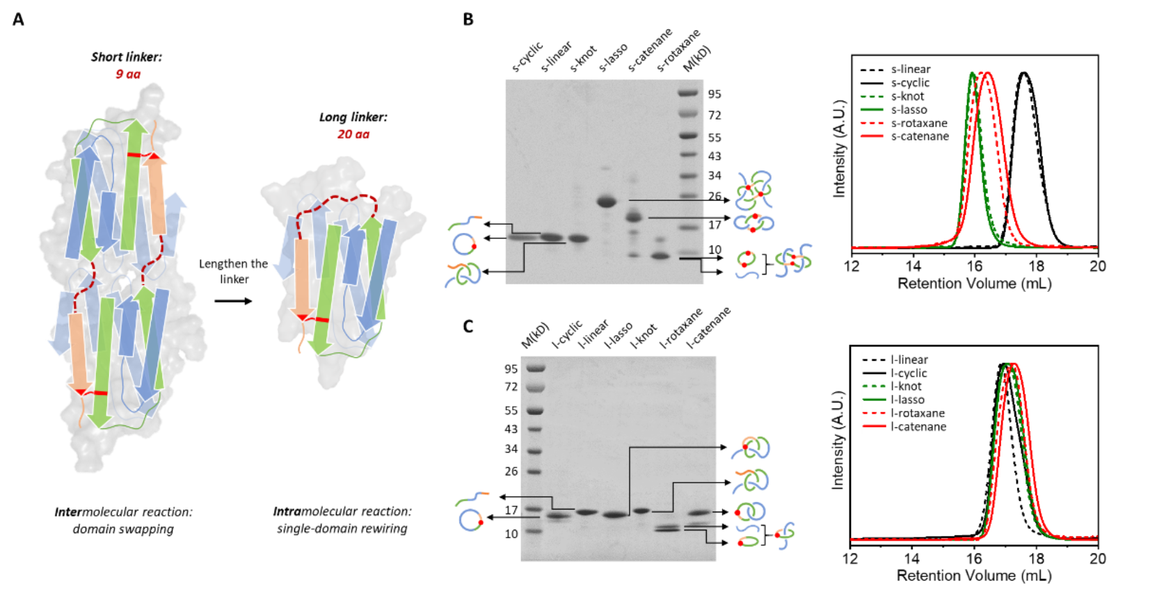 图2.A, 连接链的长度对单结构域拓扑亚型合成选择性的影响。B, 短链接链样品的合成结果。C, 长链接链样品的合成结果。