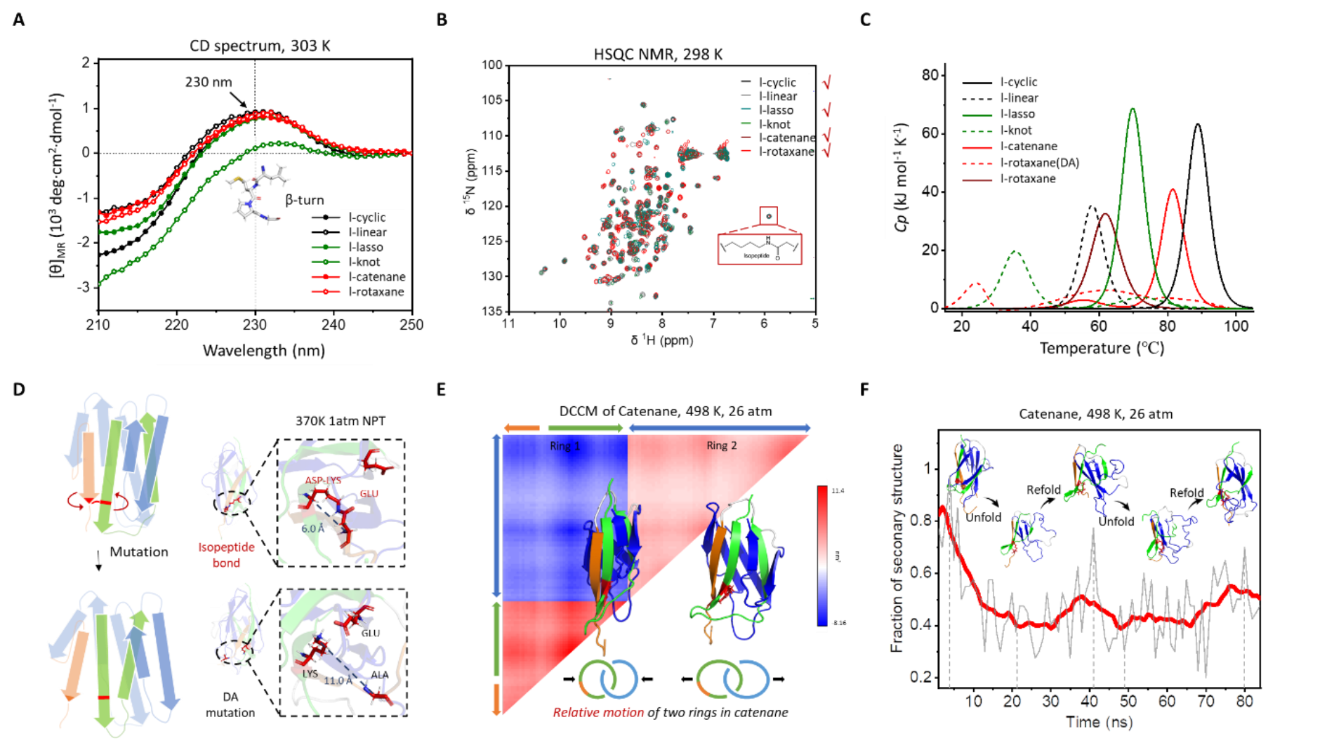 图3.A, 长链样品的圆二色谱表征结果。B,长链样品的二维核磁表征结果。C, 长链样品的差示扫描量热法表征结果。D, 不含异肽键的突变体中氨基酸逐步远离。E, 索烃蛋白的两个环呈现出明显的负相关运动。F, 索烃蛋白的解折叠模拟中还观察到了瞬时的二级结构恢复现象。