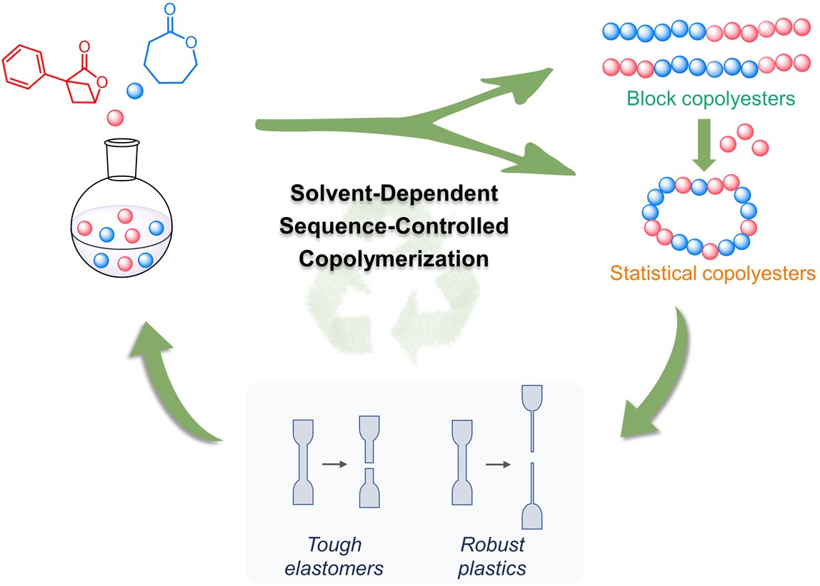 当R = Ph时,聚酯P(4Ph-BL)表现出高熔点、高模量、强而硬的材料特性,但是其断裂伸长率仅为5%,存在着一定脆性问题。为此,研究团队采用柔性单体ε-己内酯(ε-CL)与4Ph-BL进行开环共聚,在增韧材料的同时,探索了共聚物序列分布精准控制的新方法。通过利用两种单体之间的聚合动力学差异,在非配位性溶剂(如二氯甲烷)中一锅法混合投料,可制备线形嵌段共聚物;而在配位性溶剂(如四氢呋喃)中,则因大量的酯交换反应促进了环状无规共聚物的生成,并且共聚物的无规程度与溶剂的配位能力密切相关。基于这一有趣的实验现象,研究团队首次提出了“溶剂调控的一锅法序列可控开环共聚合”的新方法。所得共聚物不仅继承了P(4Ph-BL)非常优异的热稳定性,还表现出从塑料到弹性体的丰富可调性能(图2)。