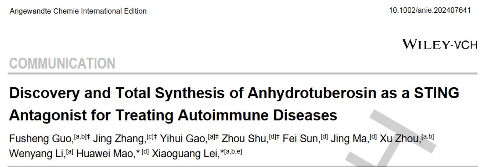 2024年10月30日,北京大学化学与分子工程学院/北大-清华生命联合中心雷晓光教授团队与首都医科大学附属北京儿童医院毛华伟教授团队合作在《德国应用化学》(Angew. Chem. Int. Ed.)杂志上在线发表了题为:“Discovery and Total Synthesis of Anhydrotuberosin as a STING Antagonist for Treating Autoimmune Diseases”的研究论文,通过高通量筛选首次发现并阐明了天然产物Anhydrotuberosin(ATS)是一种新型的STING小分子拮抗剂,且具有良好的抗自身免疫疾病活性。该研究还开发出首条高效的ATS全合成路线。