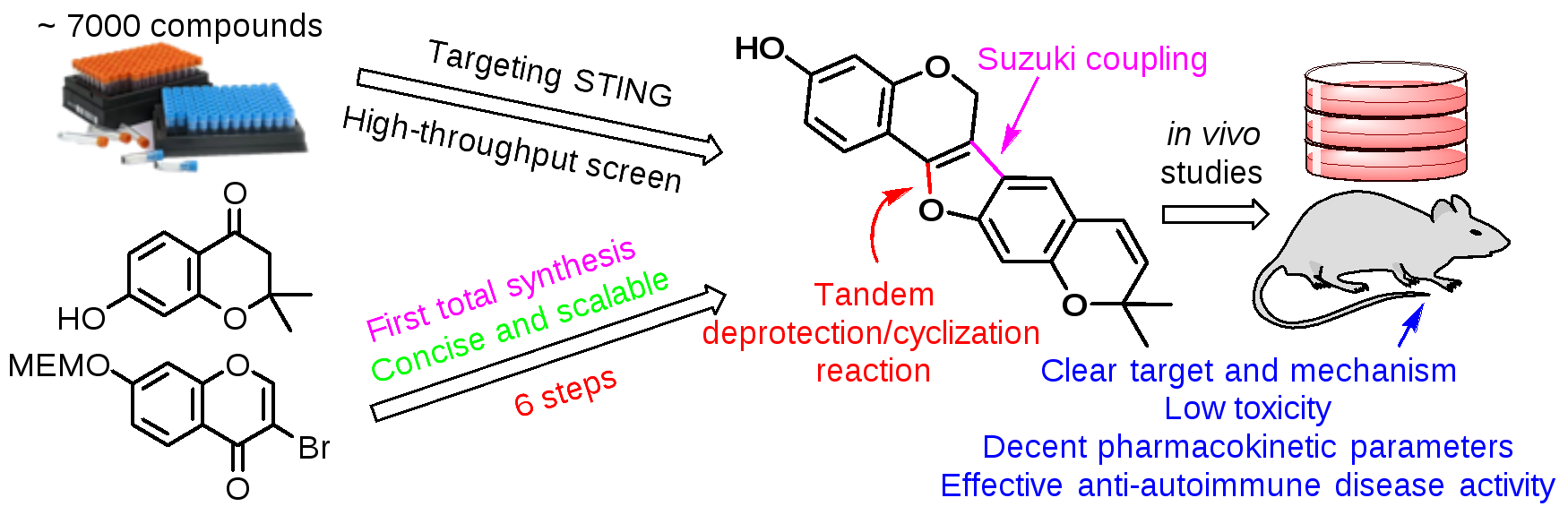 STING激活后会诱导下游干扰素IFN-β的转录,将IFN-β的启动子元件克隆到萤火虫荧光素酶的上游,同时利用海肾荧光素酶作为内参构建一套可实现高通量测试的双荧光素酶筛选体系,最终从近7000个单体化合物中鉴定到来源于葛根的天然产物ATS具有强效的STING抑制活性。鉴于ATS从植物中直接分离的得率极低,为了解决这一问题,作者从商业可得的原料出发以6步反应完成了ATS的首次化学全合成。此路线可以大量合成目标天然产物,解决了后续生物研究的天然产物来源匮乏问题。之后在蛋白水平证实ATS和STING具有直接的相互作用,并能够在HeLa、THP-1及SAVI病人来源的PBMC等多种细胞中显著性抑制STING激活后的下游信号。同时协同分子对接、关键氨基酸突变及ATS衍生的集成研究手段初步解析了ATS和STING蛋白的结合模式。最后,作者确认ATS在小鼠体内具有良好的药代动力学参数,并在与STING过度激活相关的Trex1敲除的自身免疫炎症疾病小鼠、葡聚糖硫酸钠诱导的炎症性肠病小鼠模型中证实ATS能够通过抑制STING缓解自身免疫疾病。