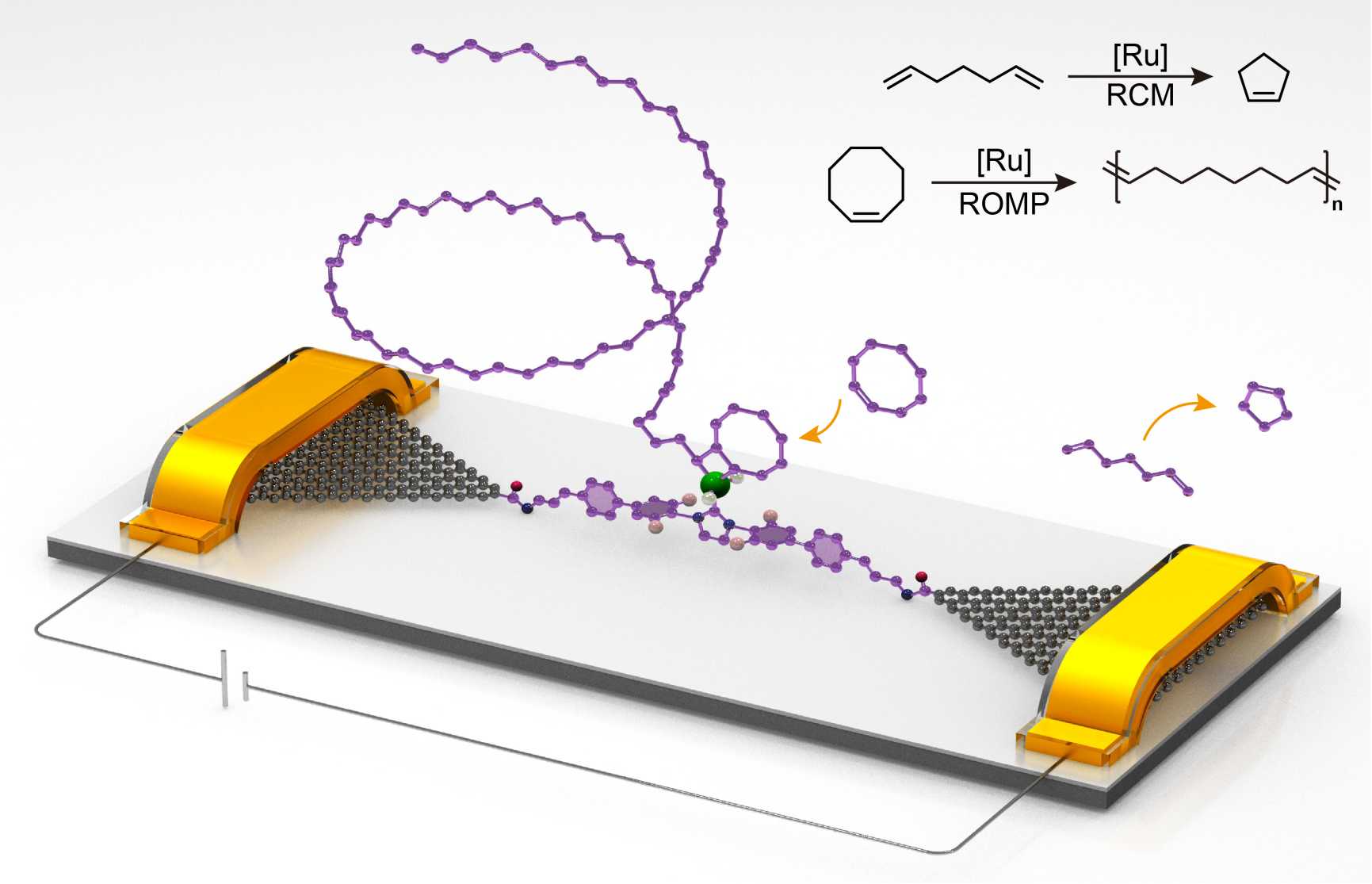 在此基础上,郭雪峰研究团队基于石墨烯电极的单分子电学检测系统,通过对关环复分解和开环易位聚合两种反应的深入探索,成功实现了以下进展,包括:对关环复分解中的生产型路径和隐藏的退化路径的实时可视化,且这两种路径均可通过外部电场进行调控(图2)。同时,他们发现了退化路径和生产型路径具有意想不到的促进型耦合效应,这表明,传统上被视为“不良”的反应路径在特定条件下能够增强目标产物的生成率,改变了人们对退化路径的传统认知。