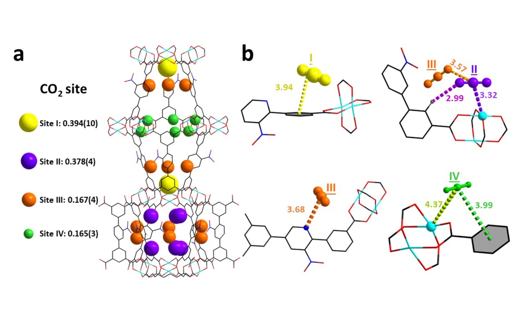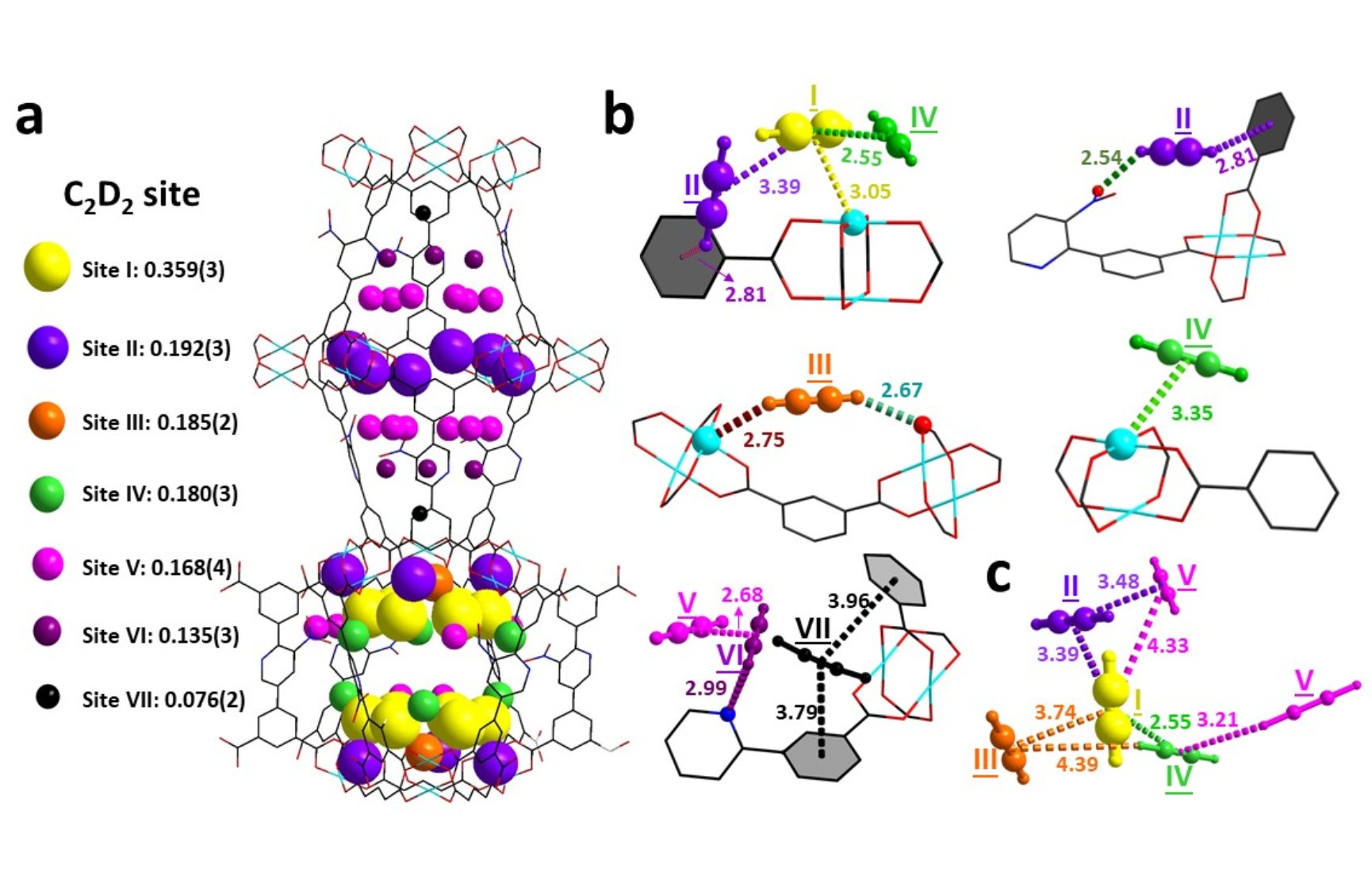 此外,研究团队还利用原位中子粉末衍射技术,观察到二价铜空位和-NO2基团之间的协同作用,并成功揭示了C2H2和CO2在MFM-190(NO2)中的选择性吸附机制。结构精修结果清晰地展示了C2D2(氘代乙炔)有七个结合位点(图2),而CO2则有四个位点(图3)。在C2D2负载的MFM-190(NO2)结构中,结合位点I(C2D2/Cu=0.359)位于球形笼子B中,并与Cu(II)位点展示出强烈的结合作用[Cu∙∙∙C≡CC2D2=3.05(2) Å]。此外,位点I还通过与位点II和IV之间的分子间作用进一步稳定[CI∙∙∙CII=3.39(1) Å 和CI∙∙∙CIV=2.55(1) Å]。值得注意的是,较小的球形笼子B在C2D2的吸附中起着重要的角色,它能够容纳位点I-V的C2D2分子。这些位点之间的分子间作用进一步稳定了C2D2分子的堆积结构,从而增强了C2D2的整体吸收。