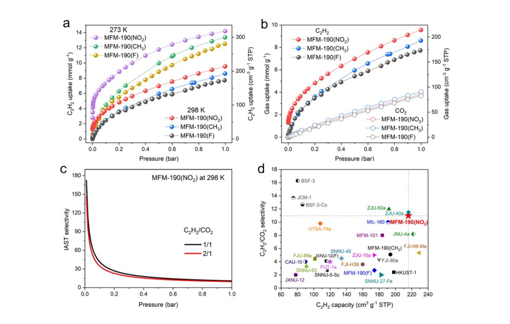 近日,北京大学化学与分子工程学院杨四海教授与英国曼彻斯特大学马丁·施罗德教授团队合作,报道了一类C2H2高效吸附纯化和存储的新材料。该工作深入探究了在MOF材料孔道中修饰不同有机官能团(如-F、-CH3、-NO2)对C2H2吸附选择性的影响,成功实现了室温C2H2/CO2的高效分离,并开发了C2H2安全存储新材料,MFM-190(NO2)。在298 K和1.0 bar条件下,MFM-190(NO2)的C2H2吸附量高达216 cm³ g-1,远超于已报道的其它材料(图1)。动态分离实验证实了MFM-190(NO2)对C2H2的高效吸附选择性。该材料的开发为工业乙炔的纯化和存储提供了新思路。