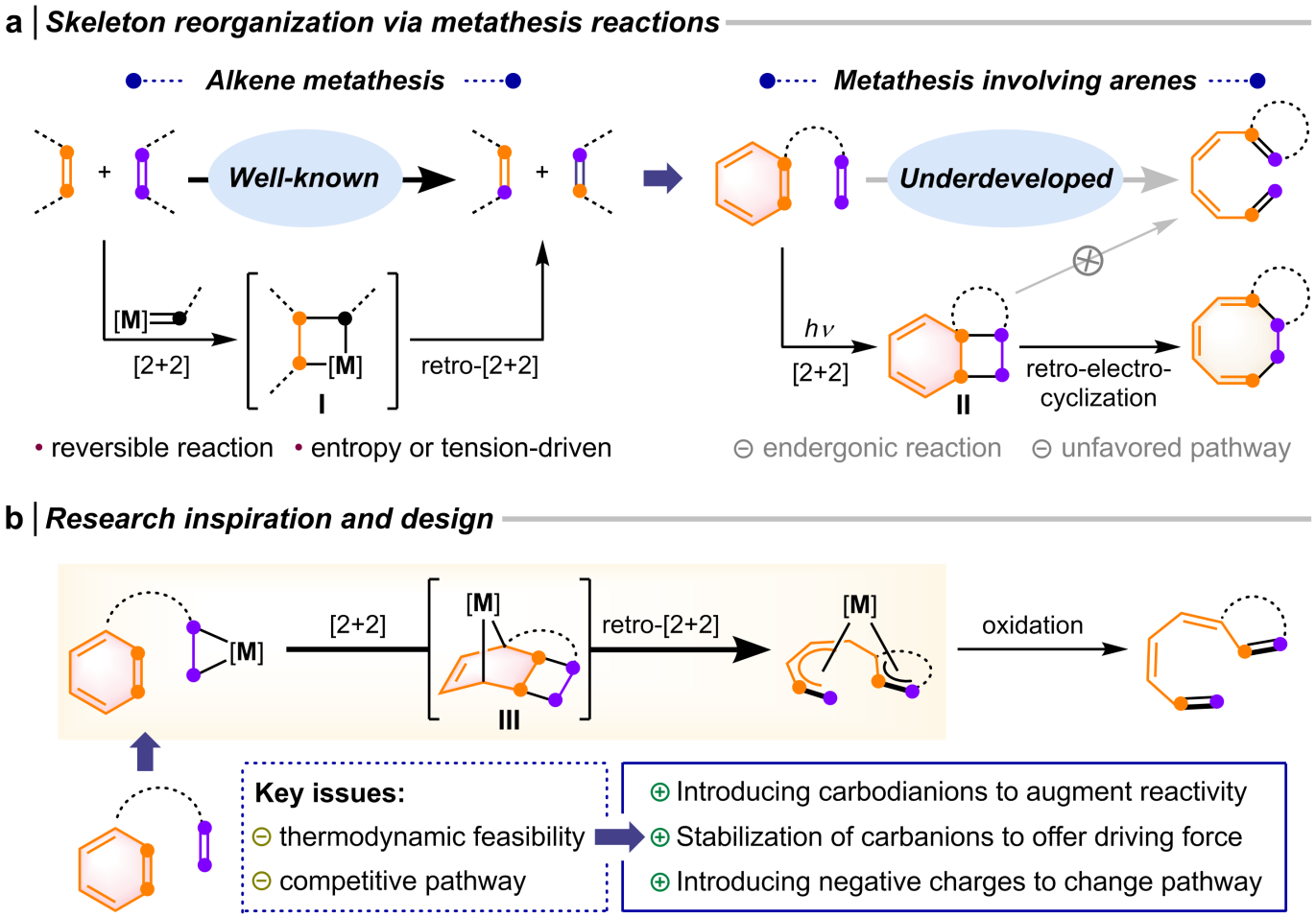 烯烃复分解反应在合成化学和材料科学中具有广泛的应用。尽管芳烃中存在潜在的烯烃单元,但芳环碳-碳键的复分解反应仍然是一个尚未探索的领域。这主要受到热力学限制以及缺乏合适反应途径的双重制约。一种潜在可行的策略是通过光激发将芳烃激发至三线态与烯烃发生反应。然而,该反应中通过[2+2]环加成生成的双环辛二烯中间体倾向于发生逆电环化生成环辛三烯,而非通过[2+2]开环得到复分解产物(图1a)。针对以上问题,他们提出了以双碳负离子替代烯烃参与芳香复分解反应的假设。该假设基于两个关键点:一是引入双碳负离子提高反应性,并通过碳负离子的稳定化提供额外驱动力;二是[2+2]环加成生成的中间体在负电荷的存在下,原有的6π逆电环化反应被抑制,从而为[2+2]开环提供机会(图1b)。