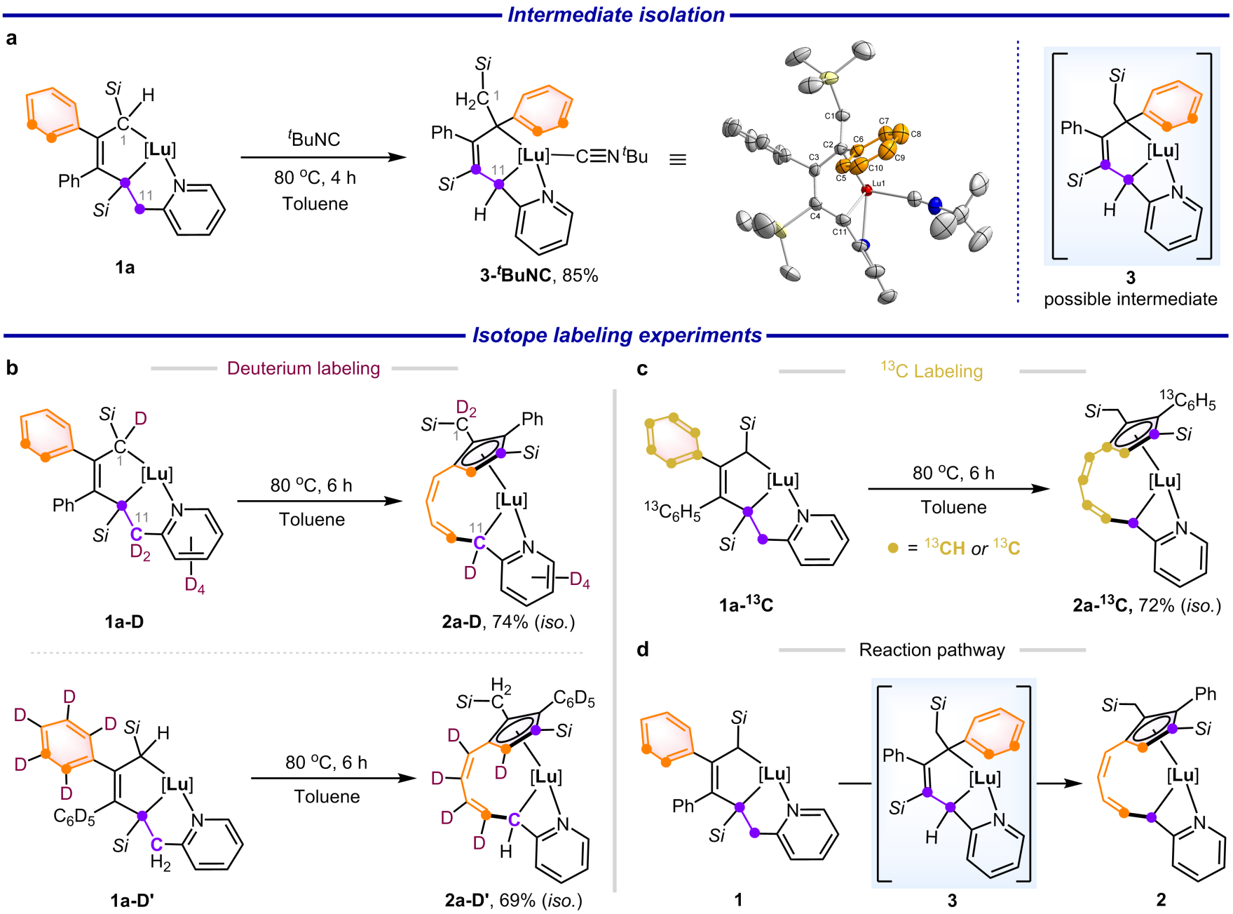 首先,他们发现镥杂环戊烯1a在加热下可转化为化合物2a(图3a)。2a的单晶结构表明其为半夹心型配合物,包含一个带有配位侧臂的多取代环戊二烯(Cp)配体,其中Cp骨架和配位的C11原子通过一个螺旋二烯片段连接(图3b)。