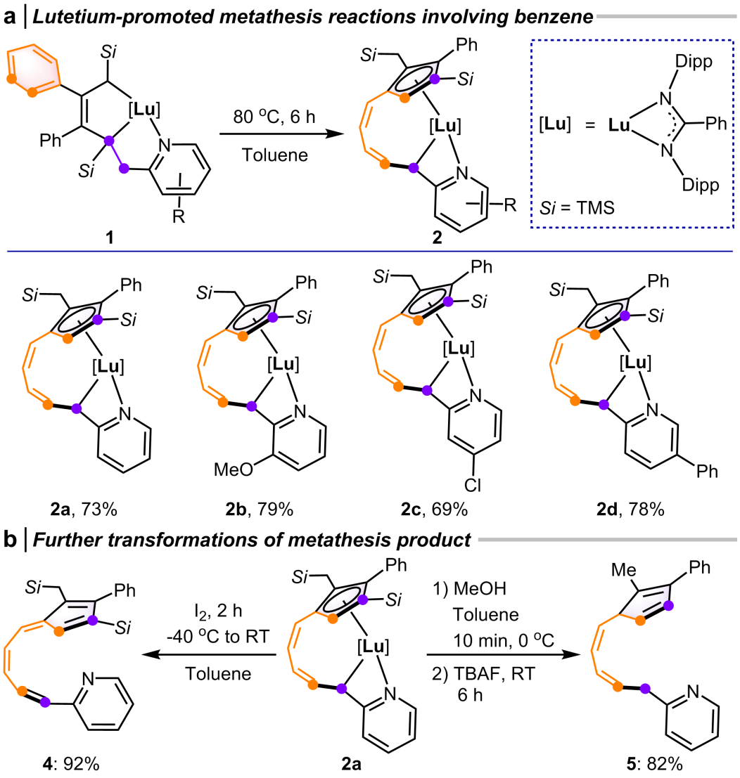 最后,他们还对苯环复分解反应进行了拓展。具有不同取代基的镥杂环戊烯均能以较高的收率得到目标产物(图6a)。2a经氧化后得到fulvene型化合物4,4可认为是形式上苯与烯烃发生复分解反应的产物(图6b)。2a经质子解及脱硅基处理,可得到多取代环戊二烯化合物5(图6b)。这些转化进一步说明了苯环开环复分解反应的潜在应用价值。