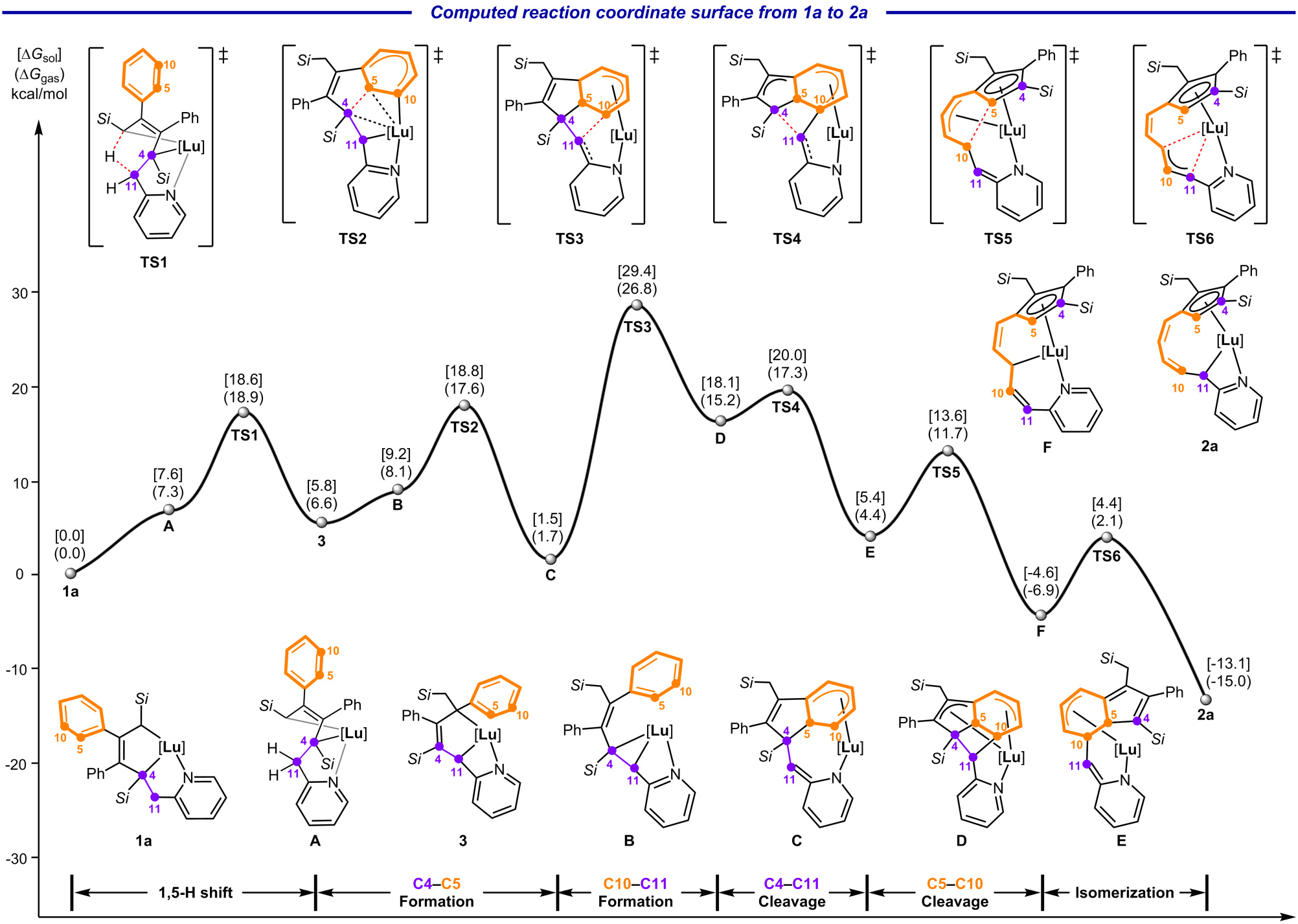 安徽大学罗根课题组通过机理计算揭示了苯环开环复分解反应的关键步骤(图5)。反应的第一步为1,5-氢迁移得到中间体3。随后,3缩环得到中间体B,B发生1,5-电环化生成中间体C,形成C4–C5键并破坏了芳香体系。进一步Lu–C键进攻C="C双键形成C10–C11键,得到张力中间体D。在环张力释放的驱动下,C4–C11键断裂得到中间体E。最终,原来苯环的C5–C10键在芳构化驱动下断裂得到中间体F,异构后生成最终产物2a。总体来看,复分解过程是通过分步[2+2]环加成形成张力四元环中间体,随后发生分步的[2+2]逆环加成,实现苯环骨架的重整。