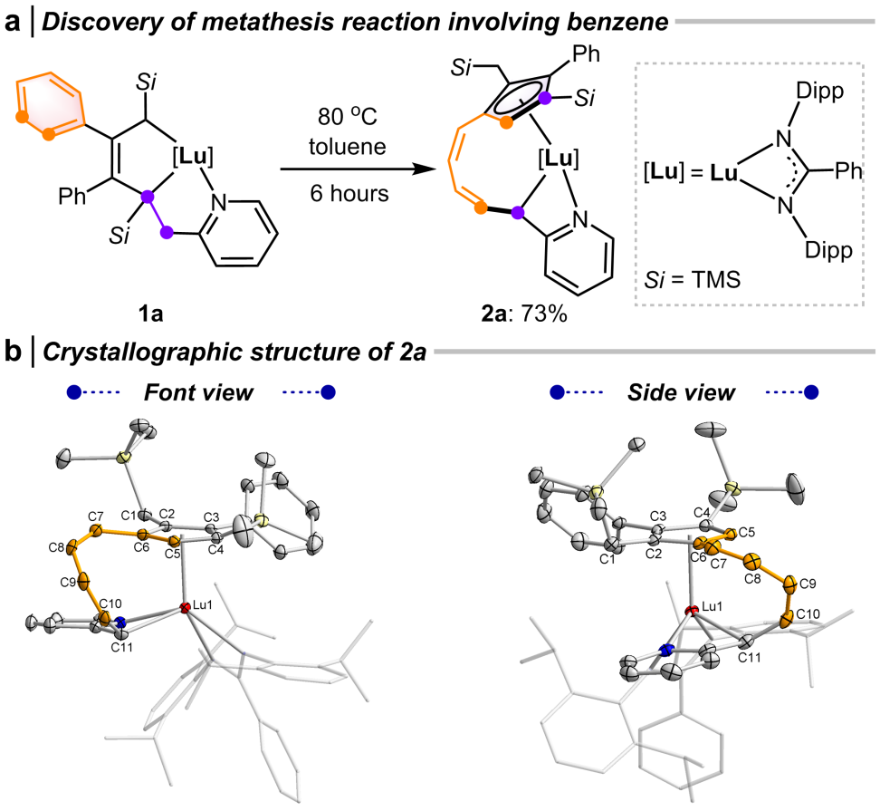 近年来,张文雄教授课题组在稀土金属杂环化学领域取得了一系列成果(J. Am. Chem. Soc. 2024, 146, 15609;J. Am. Chem. Soc. 2023, 145, 6633;Cell Rep. Phys. Sci. 2022, 3, 100831;J. Am. Chem. Soc. 2021, 143, 9151;J. Am. Chem. Soc. 2020, 142, 10705)。2023年,他们报道了稀土介导的交叉碳负离子偶联反应,可得到稀土杂环戊烯物种(Cell Rep. Phys. Sci. 2023, 4, 101479)。利用稀土金属杂环内双碳负离子的高反应性和协同效应,他们发现了首个苯环的开环复分解反应,验证了上述设想(图2)。