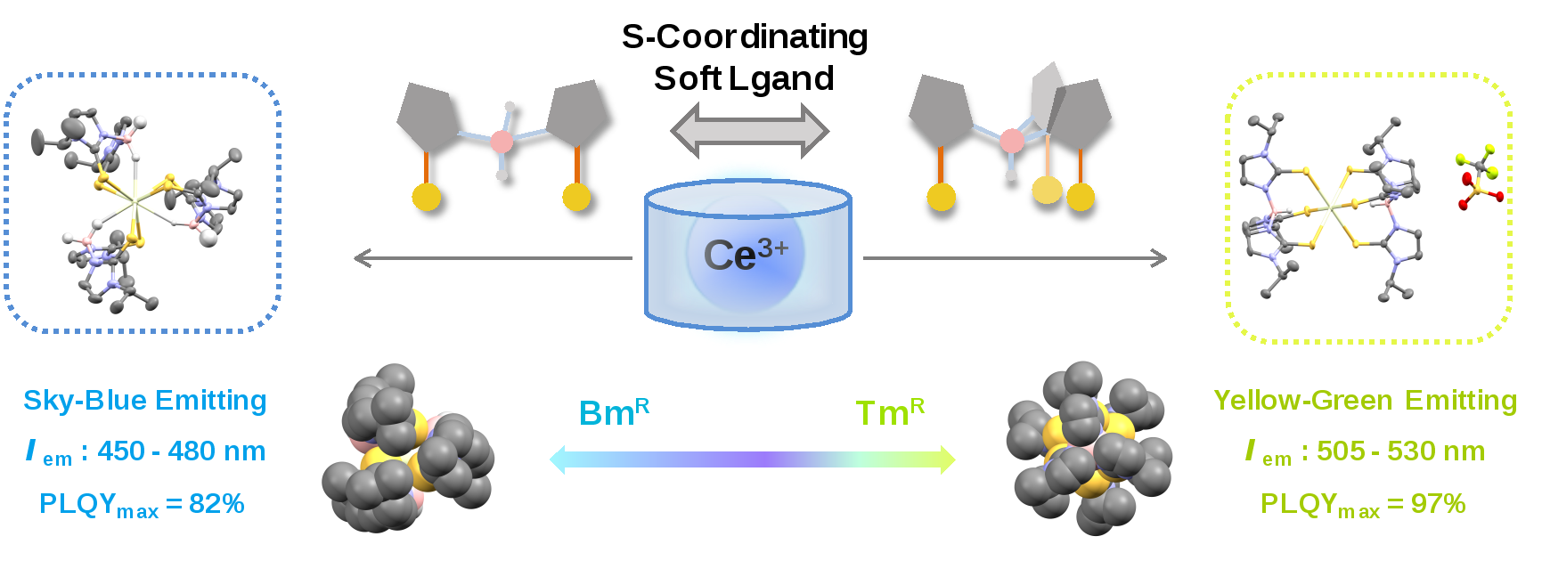 硫元素较强的给电子能力有助于引入较大的5d 质心位移、较高的电负性有助于构建较为稳定的化学键,上述特点使得硫配位螯合配体成为构建高效且相对稳定的长波发射铈(III)发光配合物的良好选择。近日,北京大学化学与分子工程学院的刘志伟研究员在Journal of the American Chemical Society 杂志上发表了题为“Luminescent Cerium(III) Complexes with Poly(mercaptoimidazolyl)borate: A New Emitter Based on S-Coordinating Ligands”的论文,该工作引入多齿硫配位的螯合配体、借助对内层配位空间的设计与调控,合成得到了两类具有高效率发光的铈(III)配合物。这些配合物具有丰富的发光机理与良好的空气稳定性,为稀土配合物的设计提供了全新思路。