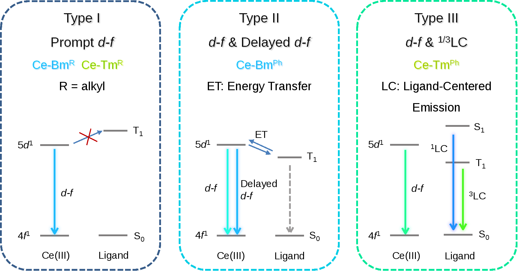 图3. 该工作中Ce(III)配合物的三种不同的发光机理。