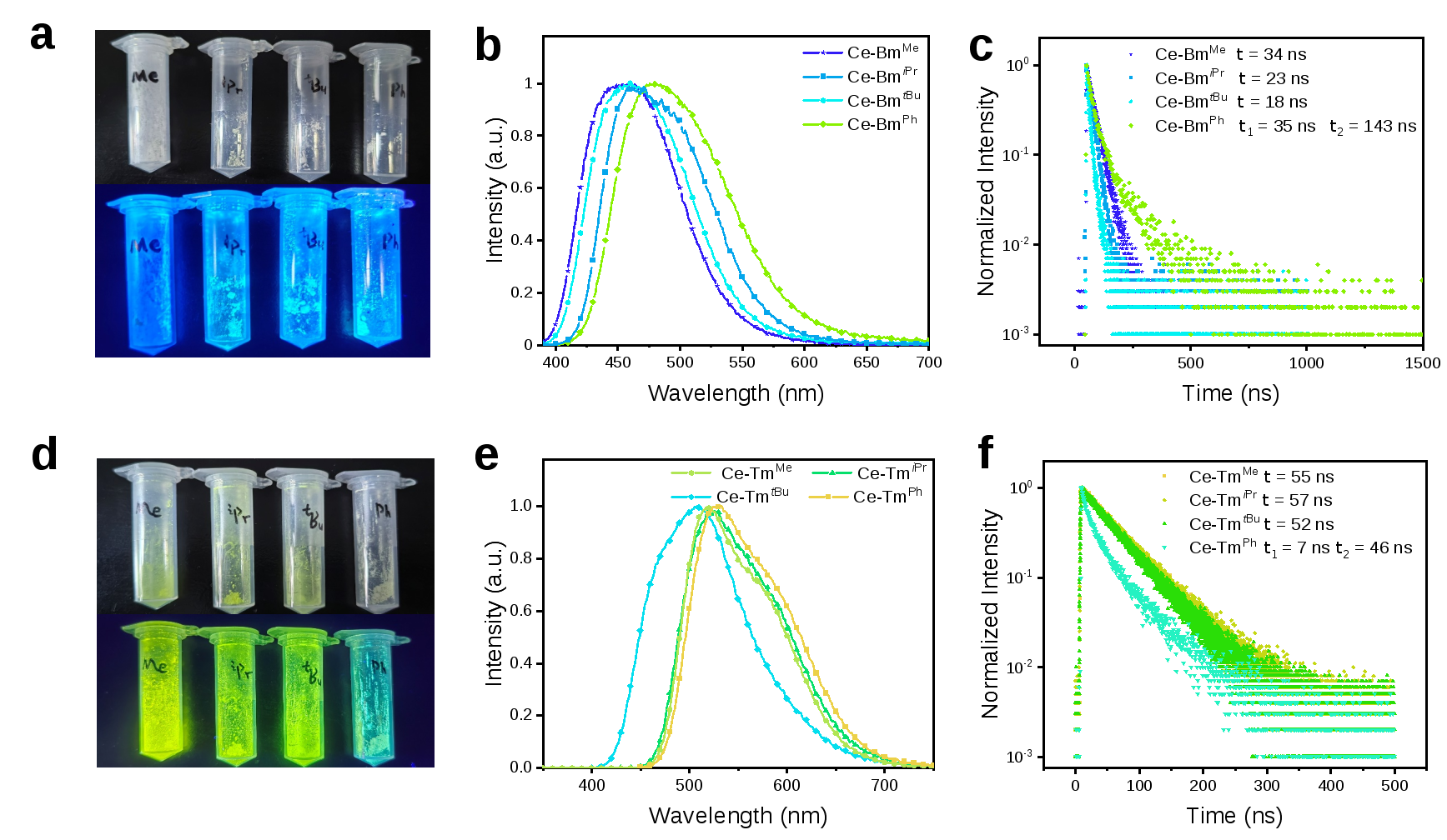 图2. Ce-BmR与Ce-TmR配合物固体粉末的照片(日光与365 nm激发)、稳态发射光谱与激发态寿命衰减曲线。