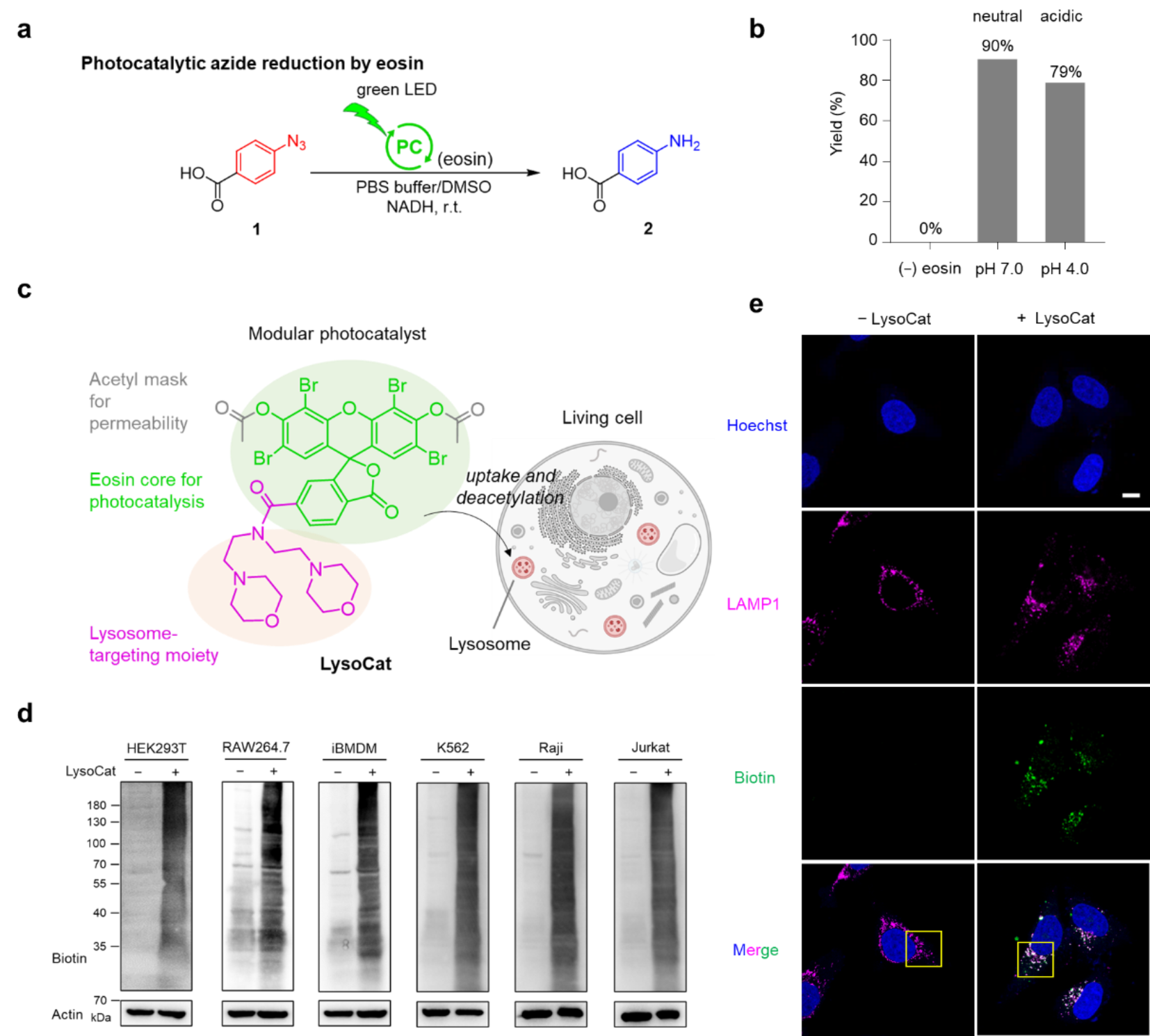 图3. 溶酶体兼容的光催化体系设计及胞内定位和蛋白质标记能力表征