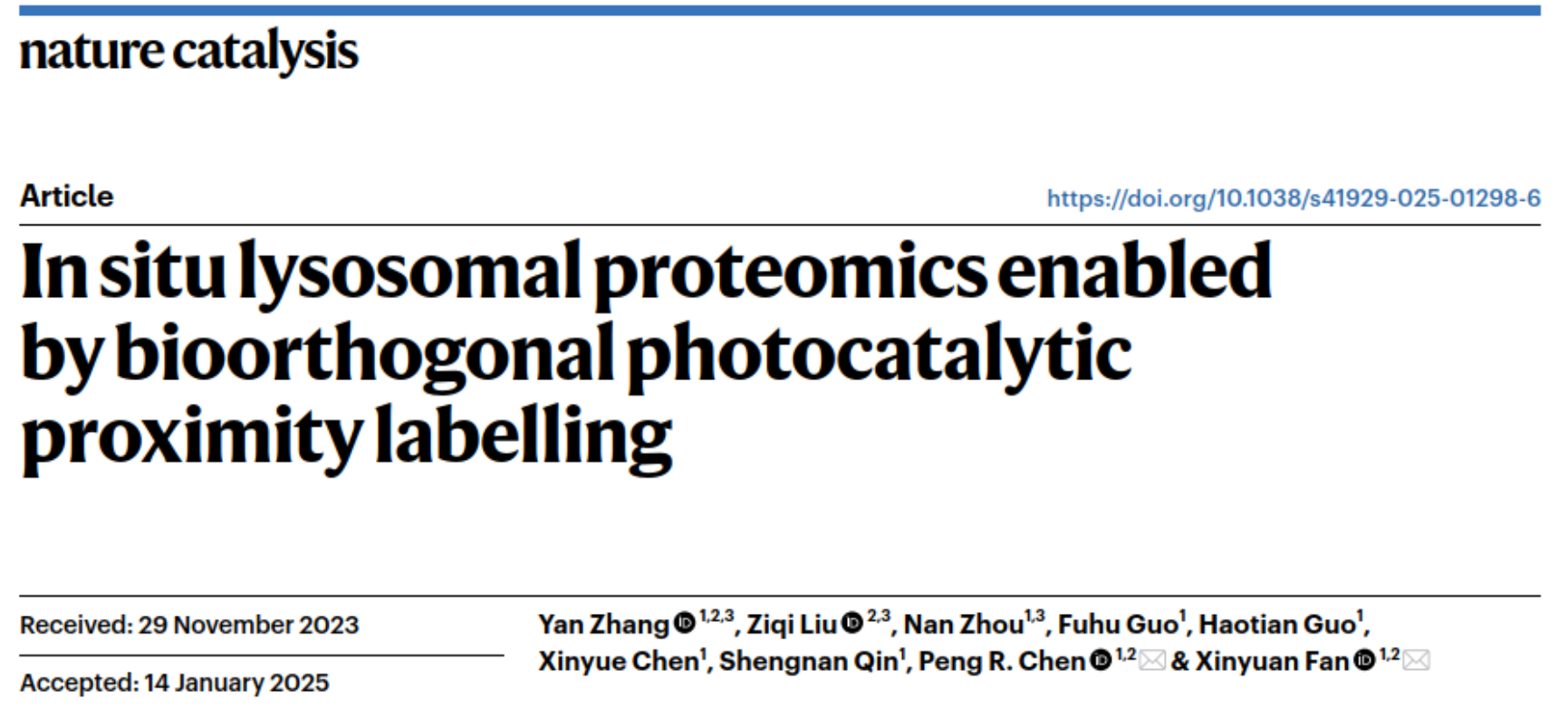 在此背景下,针对溶酶体研究面临的挑战,北京大学陈鹏和樊新元团队基于生物正交光催化原理,创新性地设计了靶向溶酶体的全新型光催化系统,开发了溶酶体蛋白质组原位解析的邻近标记技术——CAT-Lyso。该技术于近期在《Nature Catalysis》上发表,论文标题为《In situ Lysosomal Proteomics Enabled by Bioorthogonal Photocatalytic Proximity Labelling》(图1)。