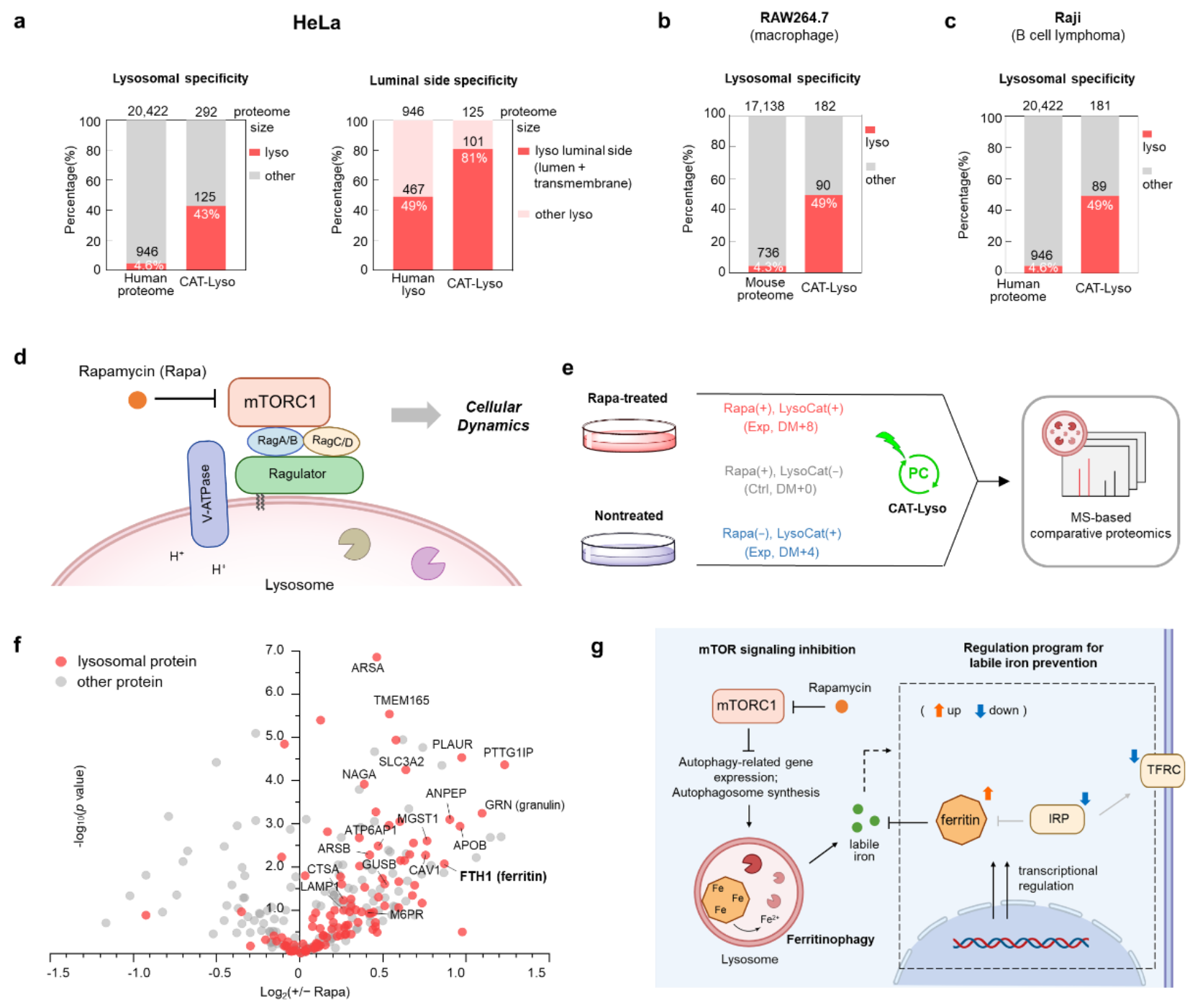 进一步,研究团队将CAT-Lyso技术与蛋白质质谱技术结合,成功构建了高效的溶酶体蛋白质组学分析平台。实验数据表明,与传统的基于溶酶体物理分离的方法(特异性约11%)相比,CAT-Lyso技术在多种细胞系中展现出显著提升的溶酶体特异性(>40%)。该技术不仅能够系统解析不同细胞类型中溶酶体的异质性特征,还揭示了溶酶体蛋白质组与细胞特异性生理功能之间的分子关联。此外,利用该平台,研究团队还成功鉴定出SCAMP3、NAGPA、GLG1和MFSD14B等新型溶酶体相关蛋白。该技术还被应用于刺激条件下的溶酶体动态蛋白质组学分析,揭示了在雷帕霉素介导的mTOR抑制条件下,细胞中出现显著的铁蛋白自噬(ferritinophagy)现象,并阐明了癌细胞通过调控铁稳态相关通路(如FTH1、FTL等)来维持细胞内铁代谢平衡的分子机制(图4)。