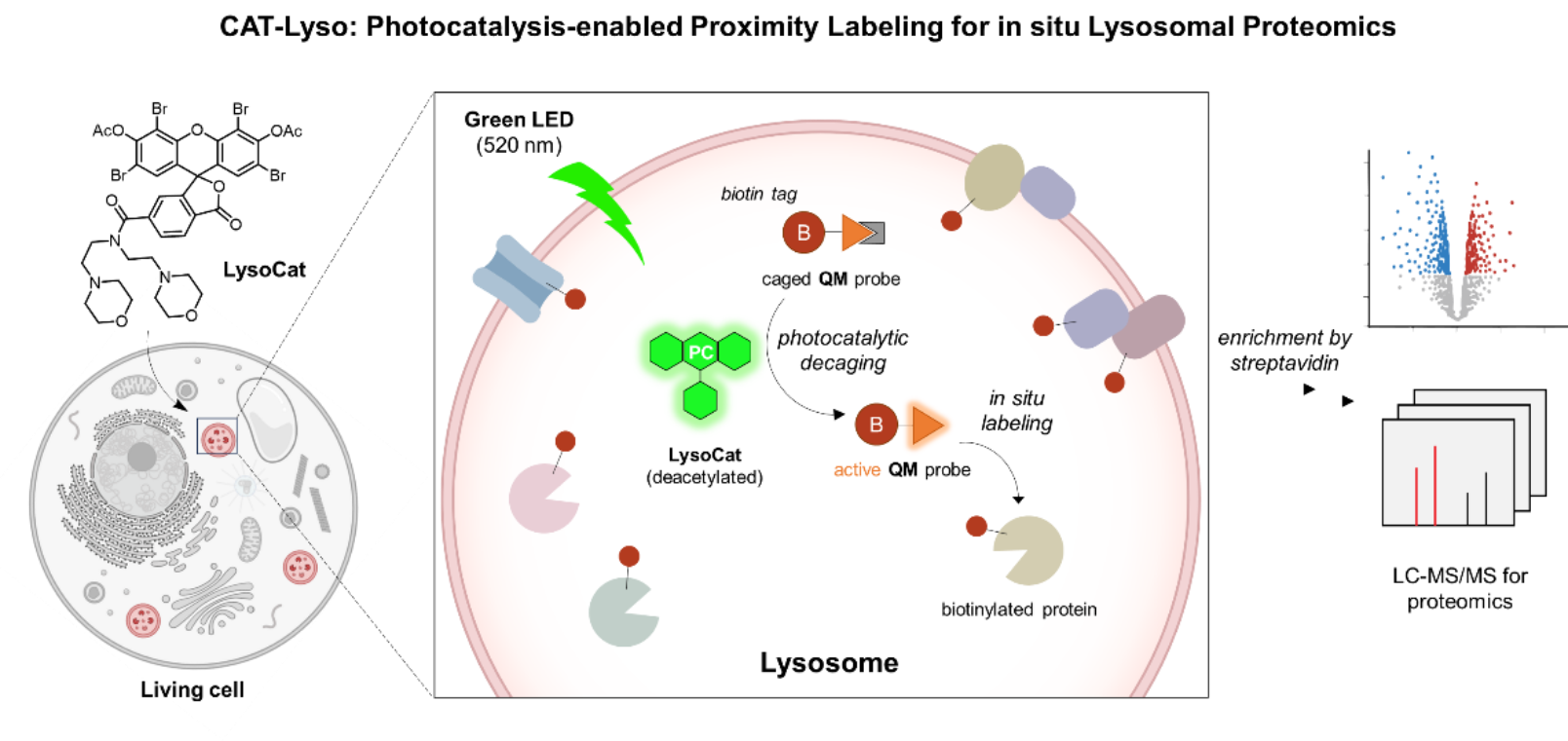 图1. 基于生物正交光催化的溶酶体蛋白质原位标记技术(CAT-Lyso)