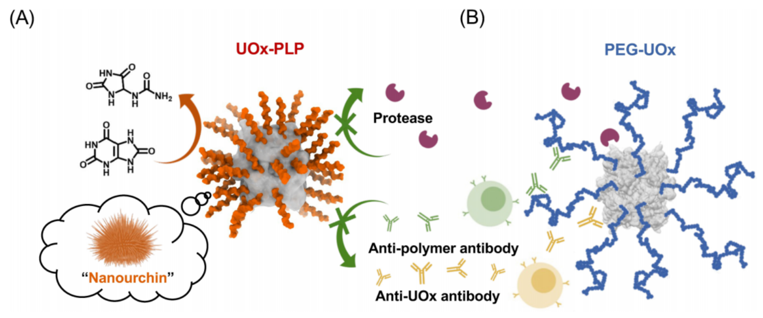 研究团队通过独创的“原位接枝聚合”技术,将刚性聚脯氨酸(PLP)以高密度原位修饰于尿酸酶表面,形成具有纳米级“海胆”结构的尿酸氧化酶-聚脯氨酸偶联物(UOx-PLP)。其核心突破包括: