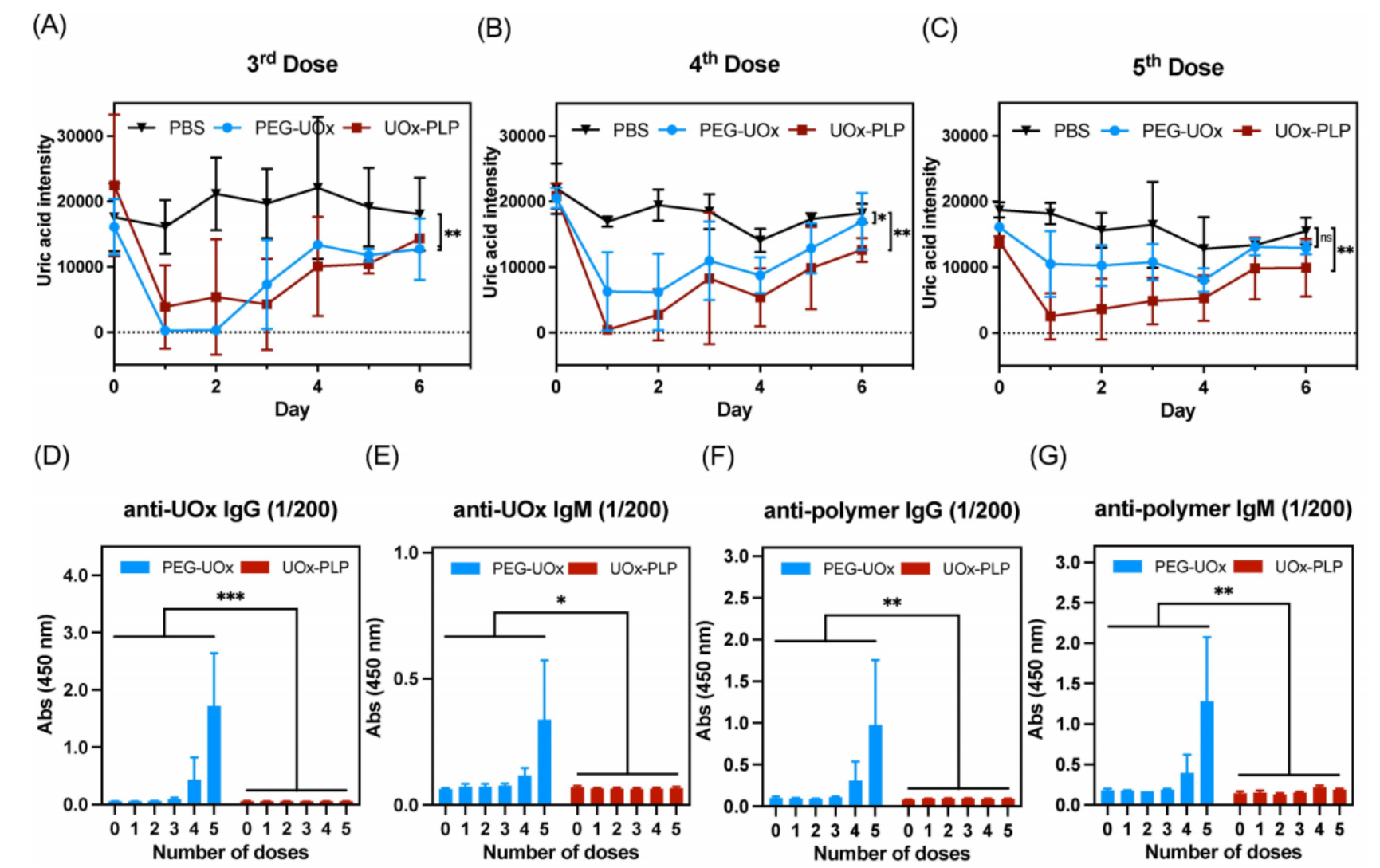 针对高尿酸血症与痛风这一严峻的临床现状,研究团队构建了拟人化高尿酸血症小鼠动物模型进行了五次连续尿酸酶给药实验。实验结果显示,UOx-PLP组小鼠的血尿酸水平在给药后显著降低,并且五次给药后疗效无明显衰减,血尿酸水平仍低于治疗阈值;此外,UOx-PLP在小鼠体内的药代动力学特征稳定,半衰期较长,能够持续发挥降低尿酸的作用。相比之下,PEG-UOx组药物在第三次后即出现明显的疗效下降,且疗效下降与其血液中抗药抗体增加在时间上高度一致。这一实验结果不仅证明了UOx-PLP在治疗高尿酸血症方面的优越性,还为该新型蛋白修饰方法的临床应用提供了有力的支持。