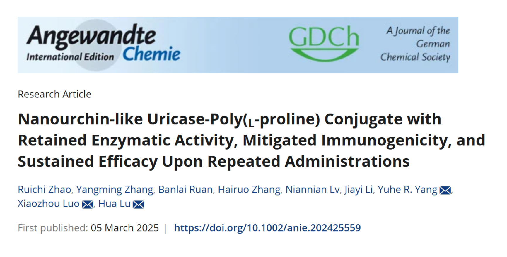 2025年3月5日,北京大学吕华团队、中国科学院深圳先进技术研究院罗小舟团队、国家纳米科学中心杨雨荷团队在Angewandte Chemie International Edition上发表合作文章“Nanourchin-like Uricase-Poly(L-proline) Conjugate with Retained Enzymatic Activity, Mitigated Immunogenicity, and Sustained Efficacy Upon Repeated Administrations”,提出一种全新的蛋白药物修饰方法,为解决蛋白药物长效化与高免疫原性难题提供重要突破手段。