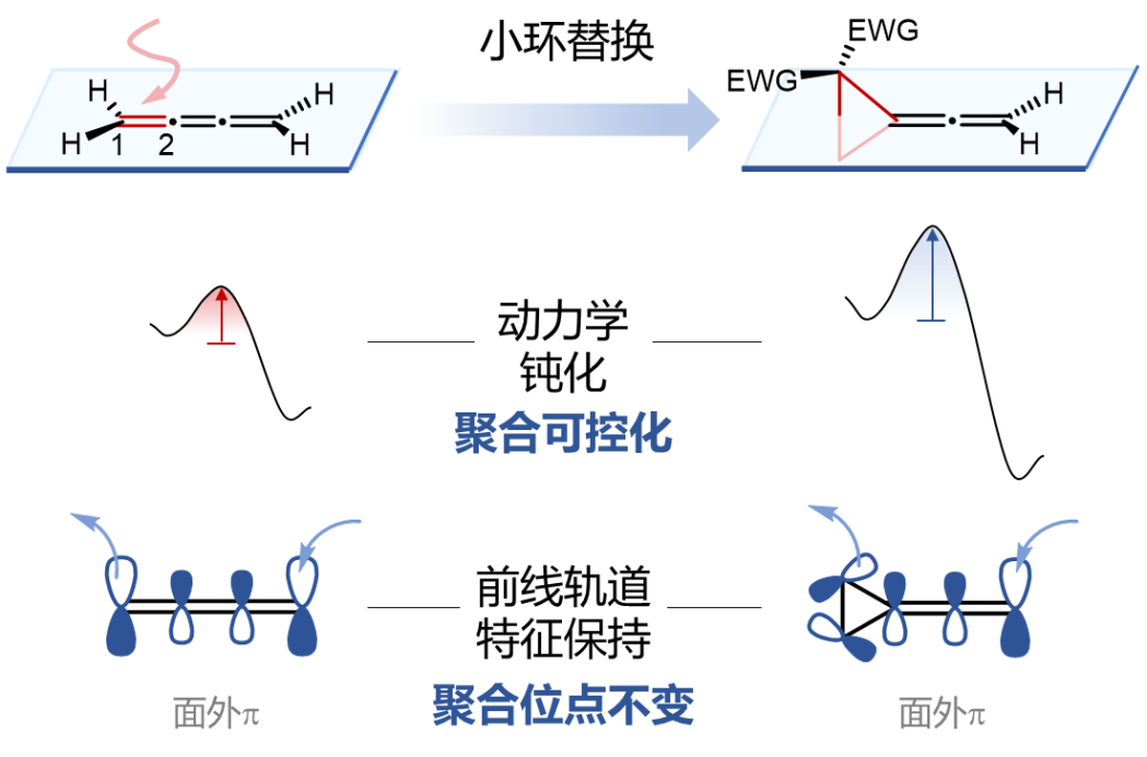 亚乙烯基环丙烷二羧酸酯(VDCP)来源于大宗化学品丁炔二醇和丙二酸酯,其在有机化学中丰富应用已有系统研究(施敏研究员等,Acc. Chem. Res. 2018, 51, 1667)。受此启发,北京大学朱戎课题组围绕累积烯烃相关高分子合成化学,揭示了VDCP的累三烯特征(图1):(1)环丙烷的基团轨道与C=C相近,前线轨道分布相似;(2)相较于普通累三烯,VDCP中张力环增强了聚合驱动力,但提高了聚合能垒,从而可实现活性/可控的1,4-开环聚合,而非普通累三烯的不可控1,4-聚合或者联烯的2,3-聚合。基于这一 “小环钝化”原理,团队前期实现了VDCP的可控开环自由基聚合(JACS. 2023, 145, 2045)。