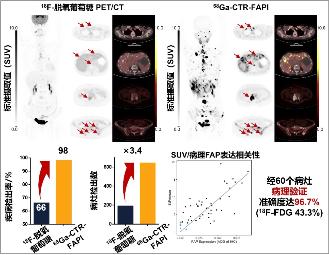 图1 在甲状腺髓样癌诊断中,⁶⁸Ga-CTR-FAPI相比于金标准¹⁸F-脱氧葡萄糖展现了显著优势